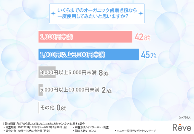 1,000円から3,000円程度と回答した方が多く、比較的手頃な価格のオーガニック歯磨き粉なら、使ってみたいと考えているようです。