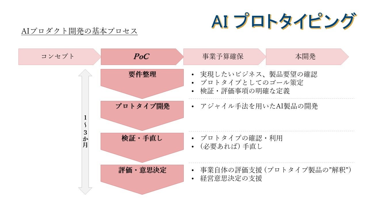 両社共同によるサービス提供は、ビジネス、AI、システム開発、新規事業といった高い専門性をベースに、クライアント企業とともに有機的にチームを組成することが可能になり、1~3か月程度の短期間で価格を抑えた形でのPoCフェーズの実行と試作製品の提供を実現します。