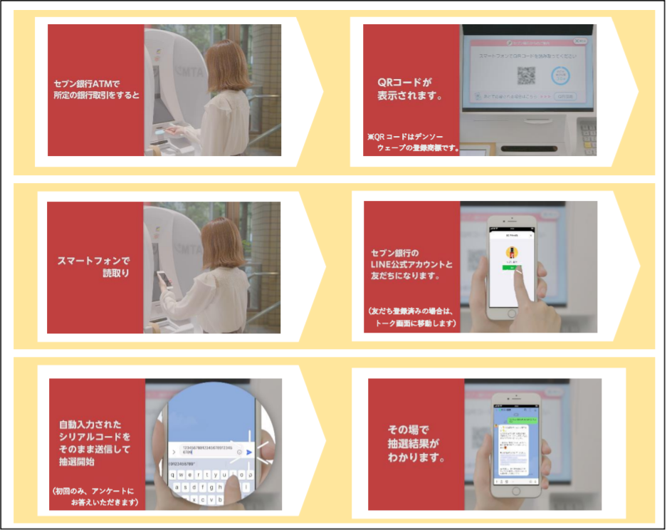 本キャンペーンでは、ATM利用者がATMの画面に表示されるQRコードをスマートフォンで読み込むと、セブン銀行のLINE公式アカウントに遷移し、トークルーム上に自動で入力されるシリアルコードを送信するだけでキャンペーンへの応募が完了、その場で抽選結果を受け取ることができます。これによりATM利用者に手軽に参加していただくことが可能になりました。