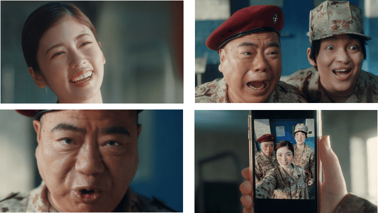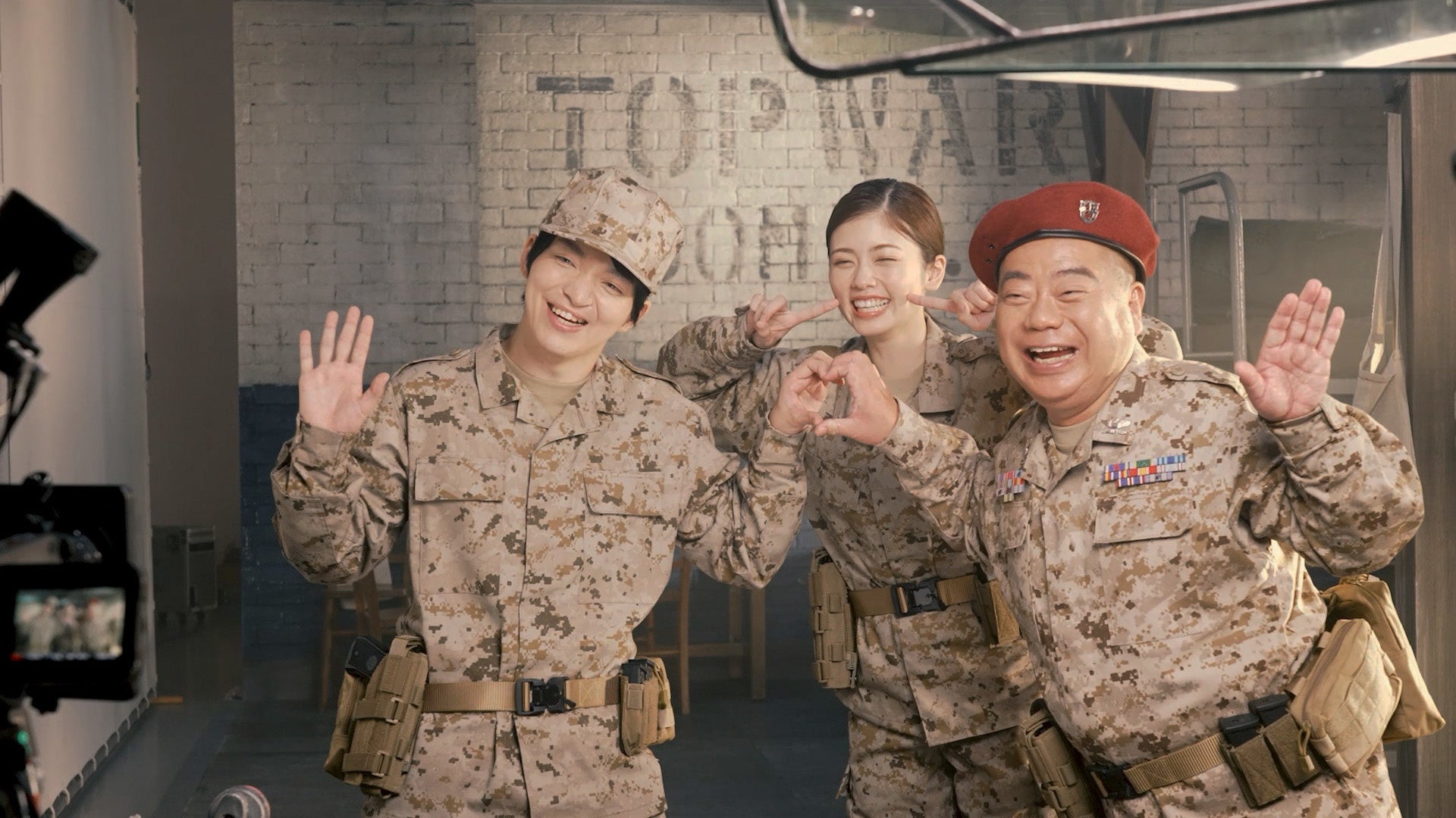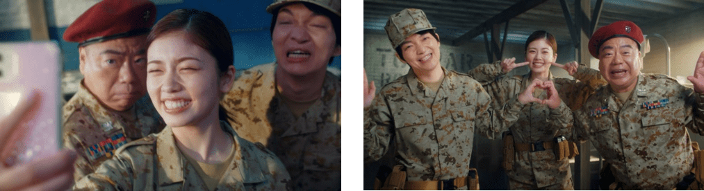 軍の宿舎にて、凛々しい表情で出川さんとほしのさんの前に立つ新人、小芝さん。出川さんが「やる気はあるか」と問いかけると、先ほどとは一転。満面の笑みで「ないけど、大丈夫そ?」と答える小芝さんに、出川さんとほしのさんは驚愕。その後もイマドキ感満載の発言を連発し、加工アプリで自撮り写真まで撮影を始める小芝さんに対し、流石の出川さんも怒るかと思いきや、3人でとびきりの笑顔で息の合った「ピッタリ♡」ポーズを披露!秒で打ち解けた3人なのでした。会話のテンポの良さや、3人のノリの良さが心地よい、簡単に合成してレベルアップできる「トップウォー」の特徴を表現したCMとなっています。