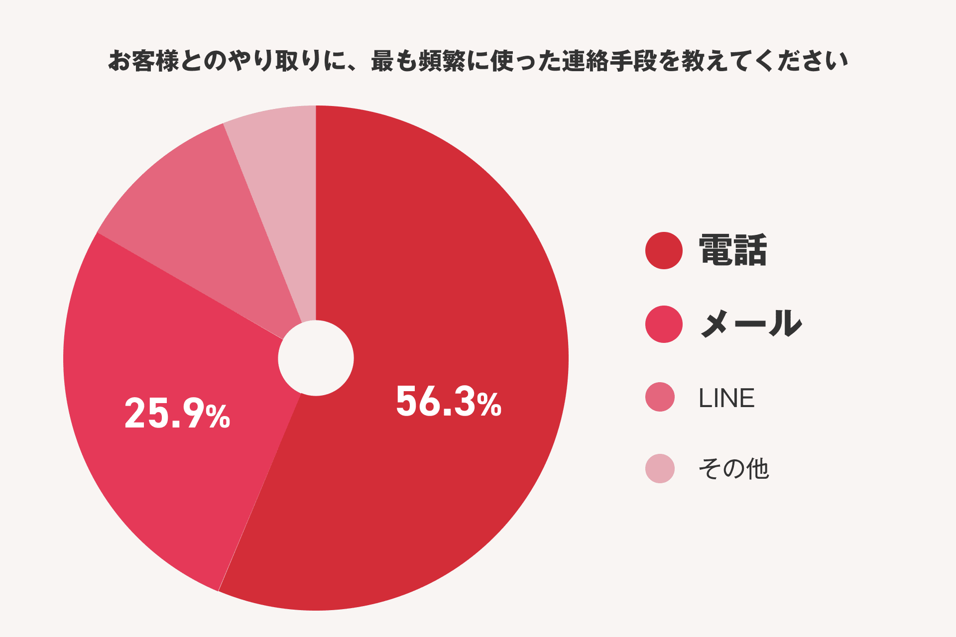 - DX化が進んでおらず、もっとも頻繁に使った連絡手段も電話が56.3%で1位と、スマホを上手に活用した接客が行えていない実情がうかがえました。