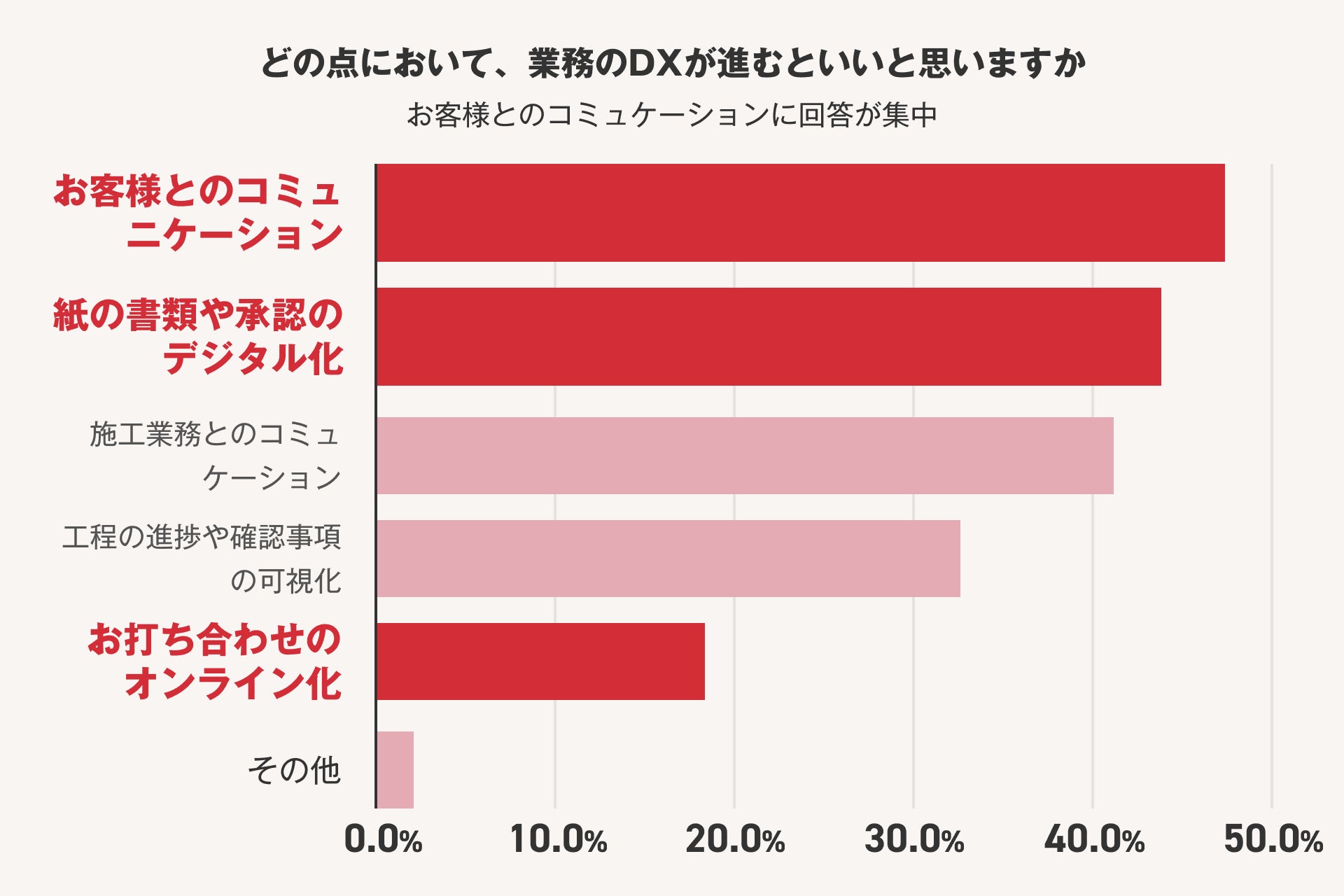- DXが進むと良いと思う業務の1位、2位、5位が「お客様との情報共有」関連で、3位、4位の施工管理関連を上回りました。