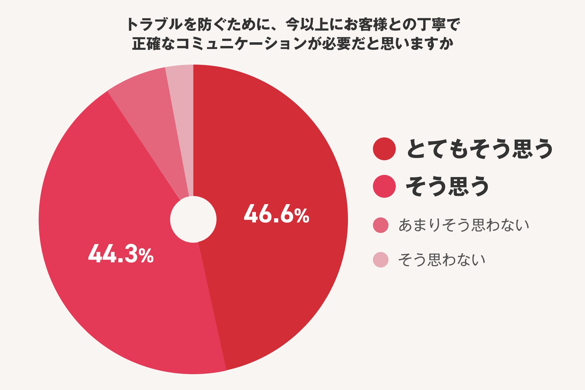 - 全体の88.5%はお客様とのやり取りでトラブルを経験しており、トラブルを防ぐために、「今以上にお客様との丁寧で正確なコミュニケーション」が必要と考えている方は90.8%に上りました。
