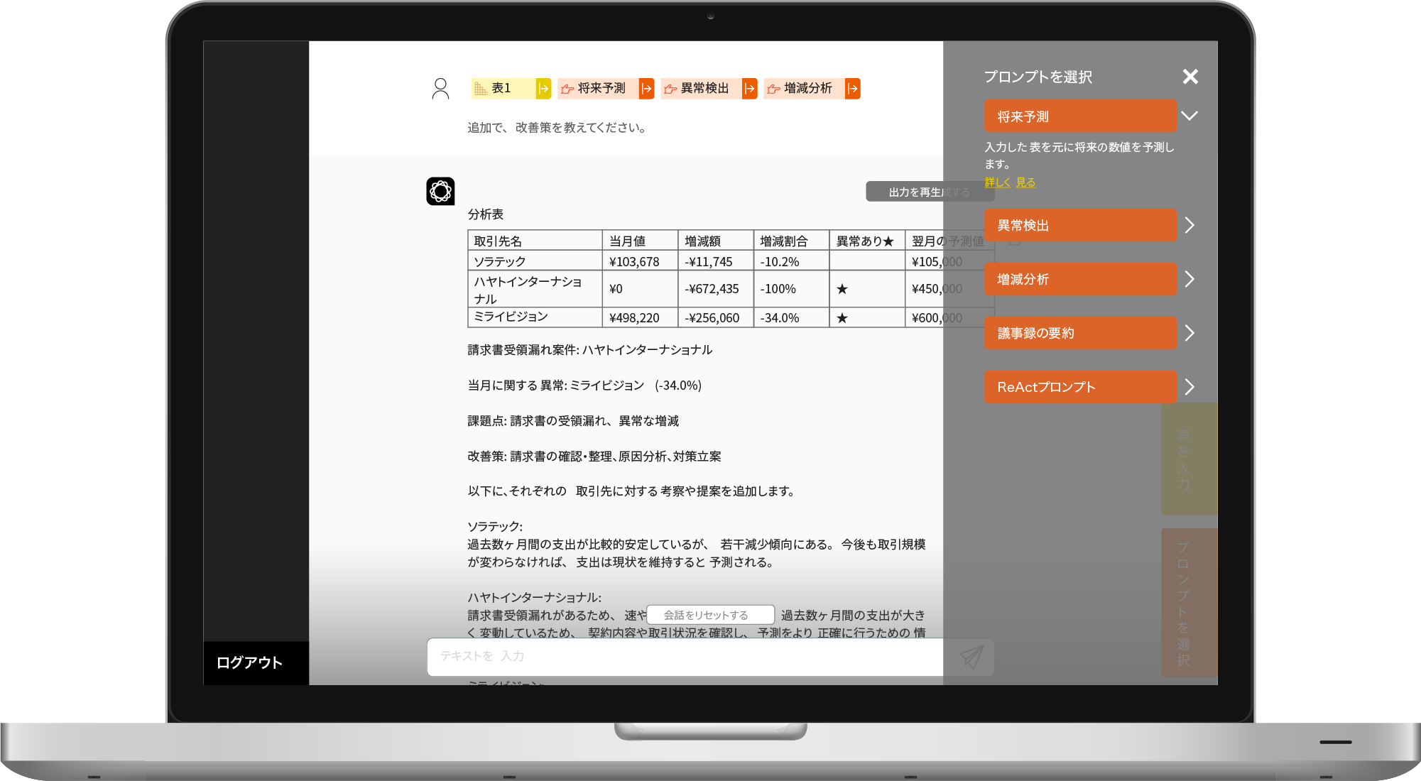 例えば、「売上高の推移を教えて」と質問すれば、表や数値で回答してくれます。また、「将来予測をして」と指示すれば、過去のデータから未来の売上高や利益などを予測してくれます。