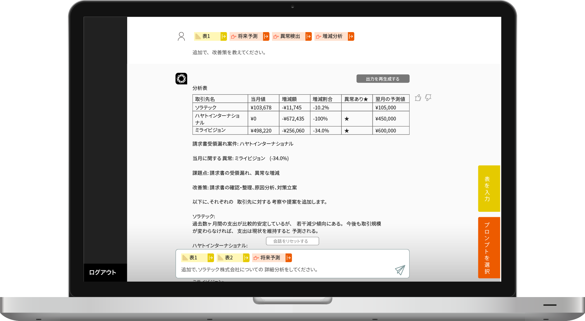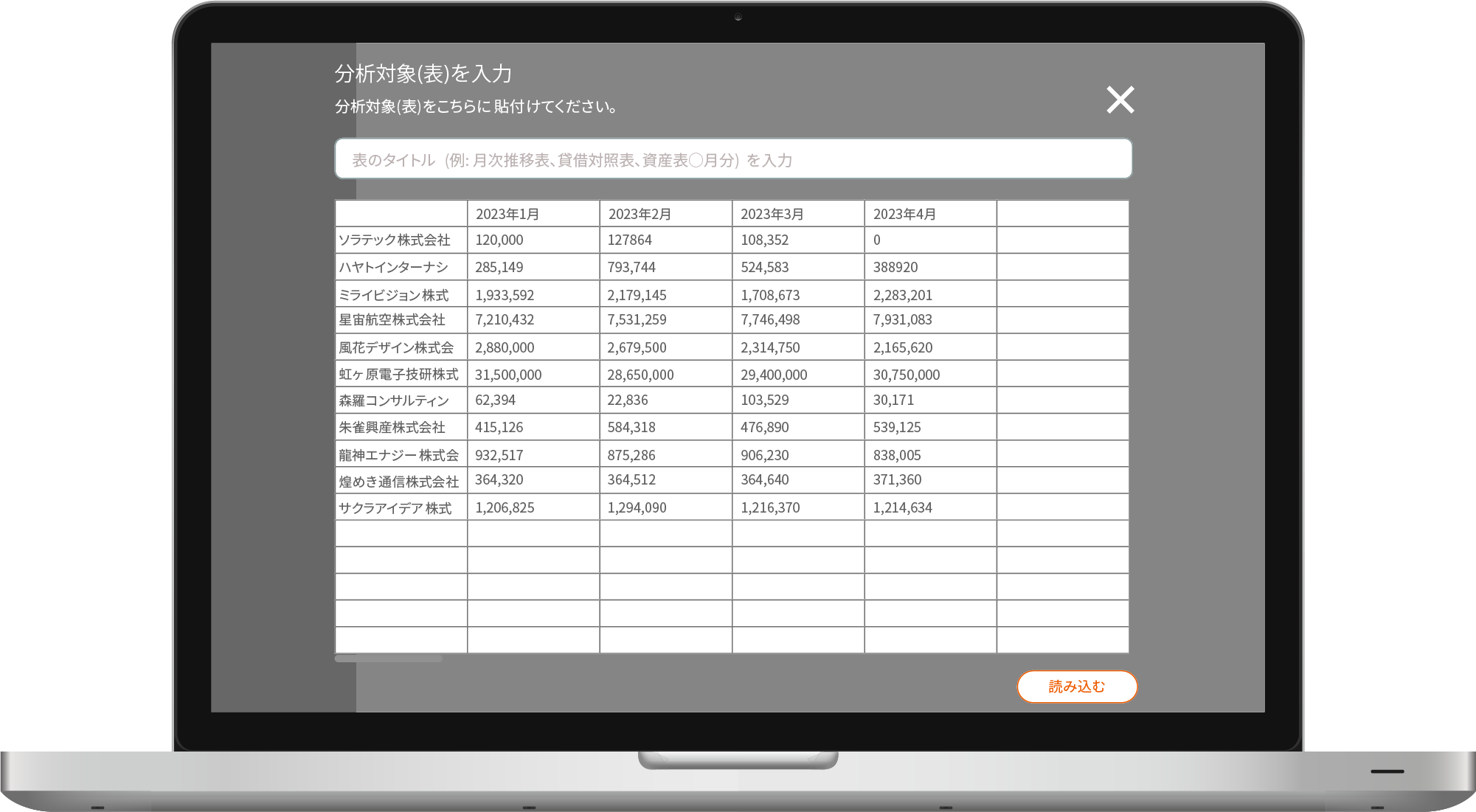 エクセル等の「表」データを入力可能にし、分析データとして取り込めるようにしました。これにより、推移表・支出管理表・入出金データなど、あらゆる財務データを取り込み、AI分析が可能になります。