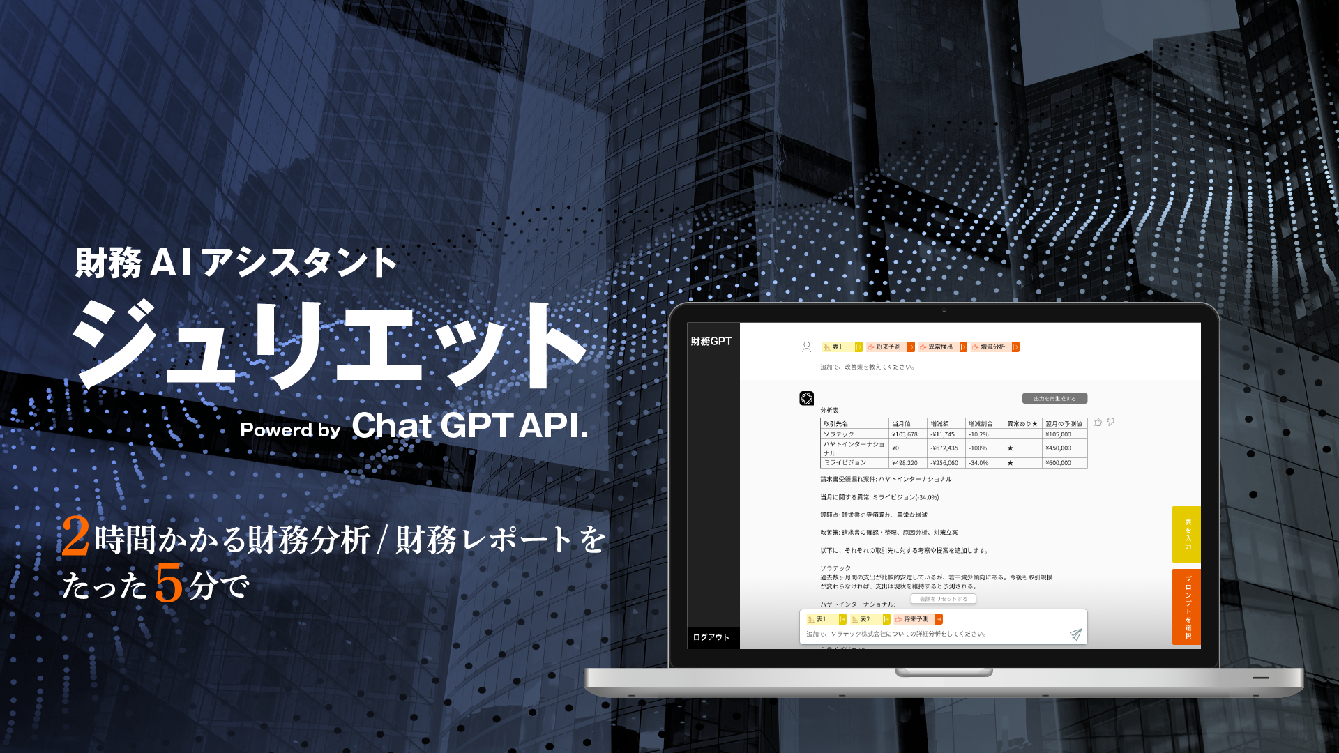 「ジュリエット」は、ChatGPT技術を活用して、財務分析のために開発されたAIです。情報漏洩を防ぐセキュリティ対策済みのため、機密情報でも安心して分析できます。