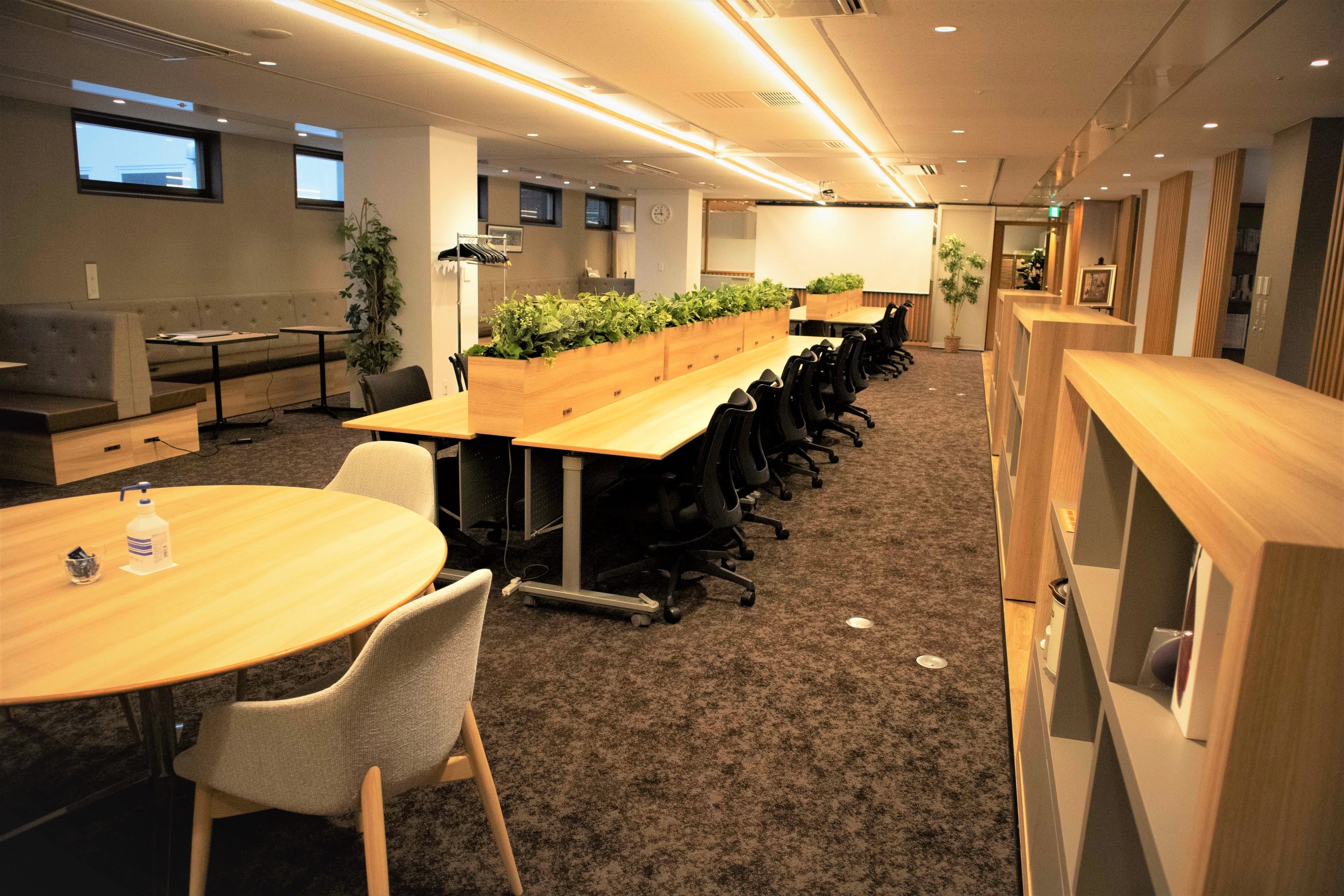 また異業種による偶発的なコミュニケーションや、雑談などオンライン上では生まれにくい交流を生み出すために、各種ルームのほかにファミレスシート、カウンターテーブル、円形テーブルやスタンドデスクと豊富に用意しております。