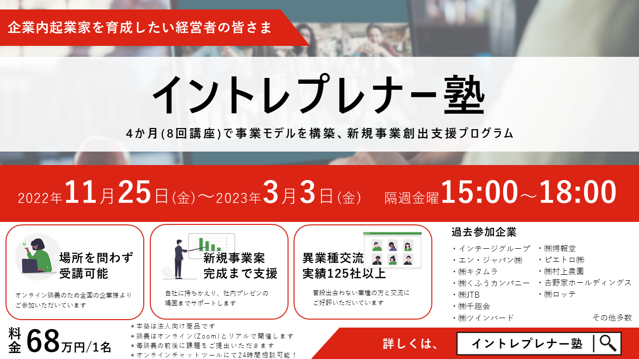 新規事業を生み出す企業内起業家育成プログラム「イントレプレナー塾」 26期参加企業募集開始【2022年11月25日開講】