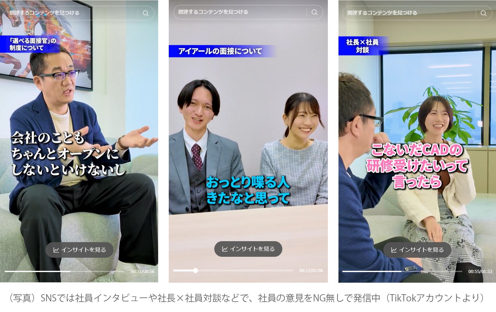 当社が目指すビジョンとともに、未経験でも建設技術者として活躍できる取り組みを伝えるため、TikTokやInstagramを中心としたSNSでの情報発信にも注力してきました。代表の大山が会社の取り組みについて視聴者へ直接語りかけるとともに、派遣技術者を含む20代・30代の社員が中心となって出演して当社のリアルな社風を発信しています(※2)。