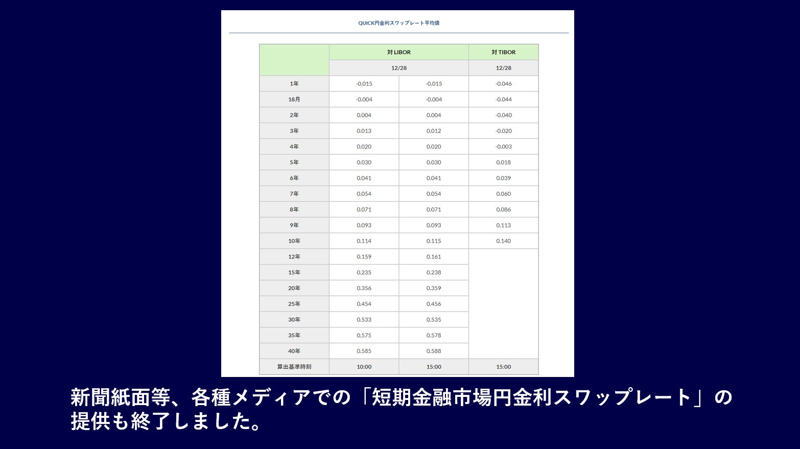 あわせて、新聞紙面等、各種メディアでの「短期金融市場円金利スワップレート」の提供も終了しました。