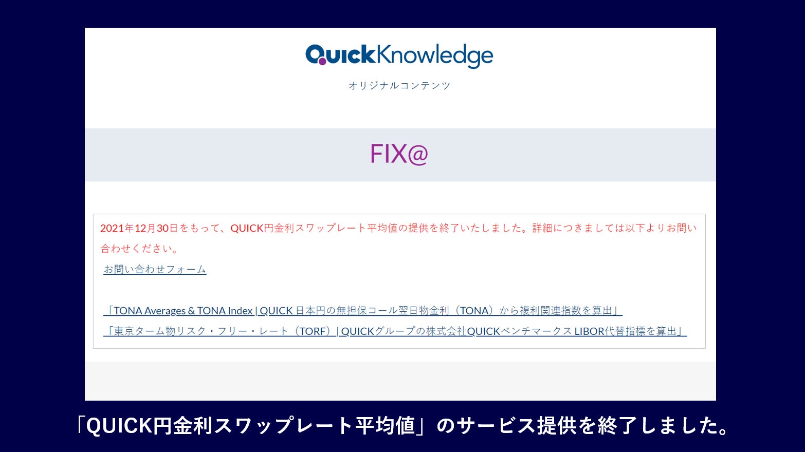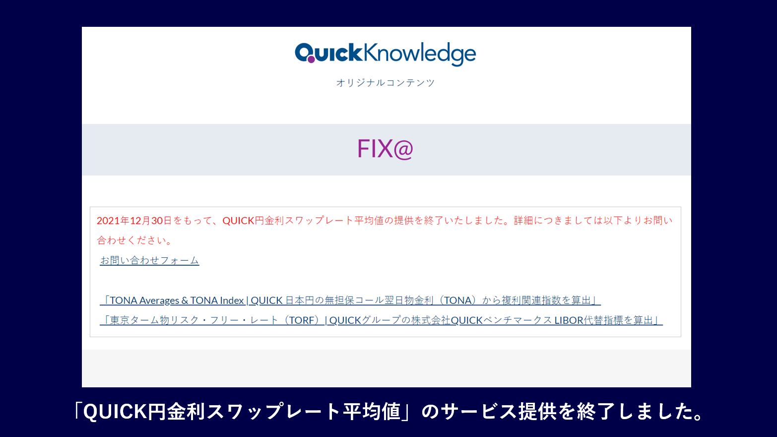 QUICKは、2021年12月30日(木)をもって「QUICK円金利スワップレート平均値」の提供を終了しました。