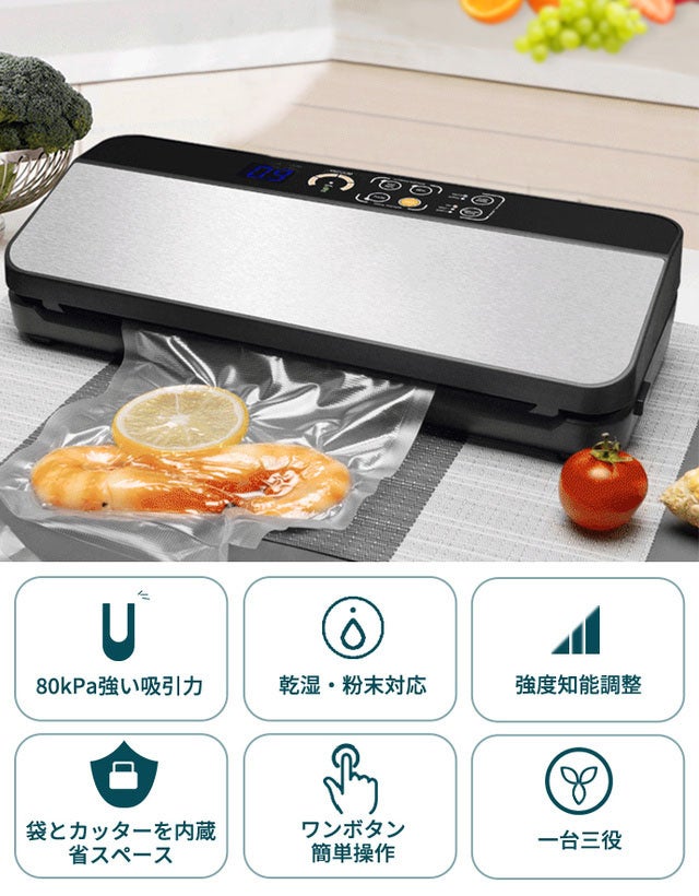 ①「強い吸引力・専用袋不要」驚きの80kpaで卵から、液体、粉末、アルミ缶まで、何でもサッと真空パック!