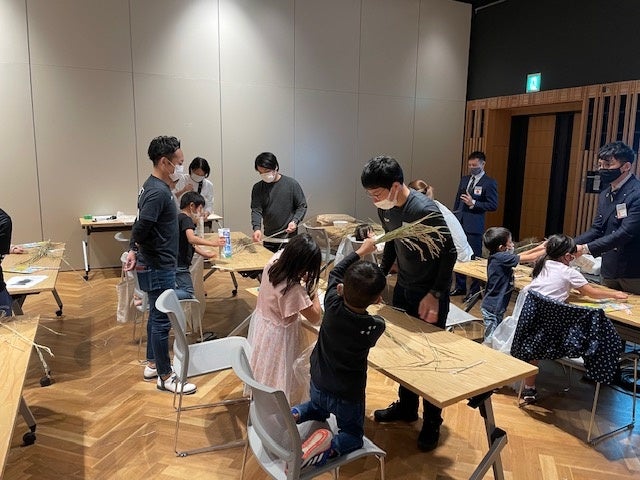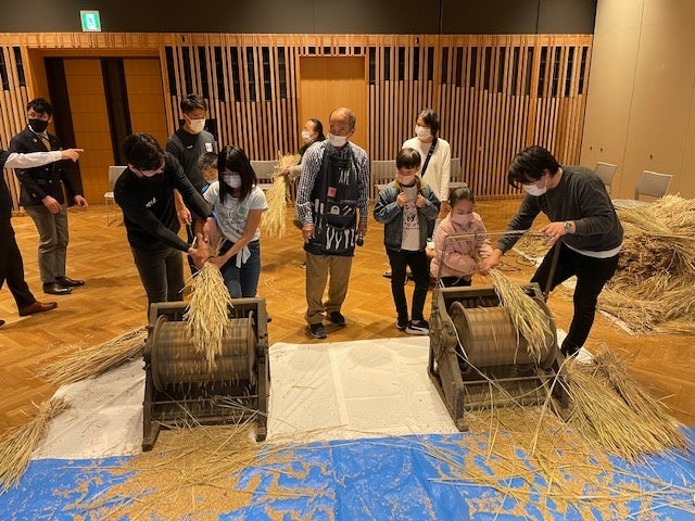 すプレゼンテーションを行いました。具体的には、フードパントリーや子ども食堂とは何か、その概要や存在意義、なぜ自分たちが脱穀と袋詰をするのかといった内容を、クイズなどを交えながら子どもたちの理解を深めていきました。最初は緊張した面持ちの子どもたちでしたが、いざ脱穀体験が始まると徐々に緊張もほぐれ、楽しそうにかつ真剣に取り組んでいました。