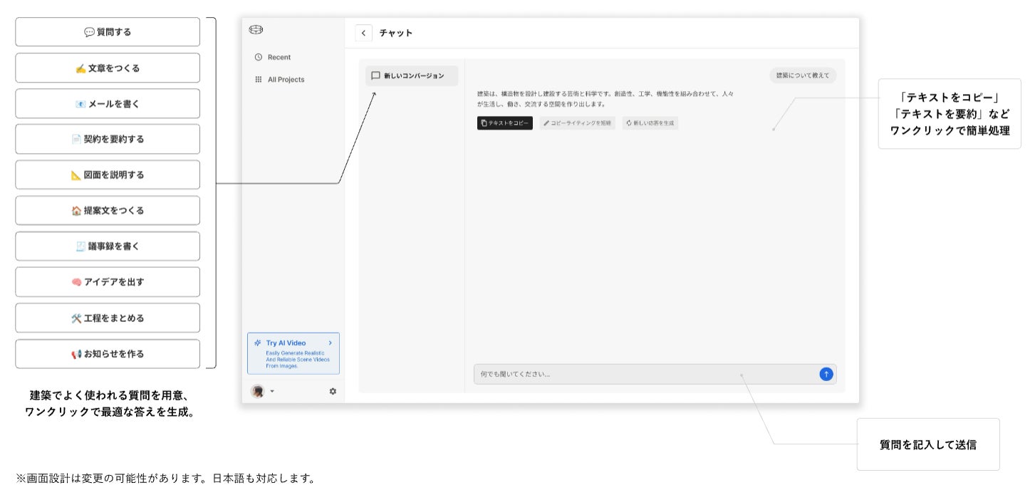 ArchiXのアーキチャットは、建築・内装設計・工務店業務に特化した質問テンプレートや文脈が、あらかじめ組み込まれています。そのため、ゼロからの入力は不要で、日常業務に即した質問に対して、的確でスピーディな回答を引き出せます。