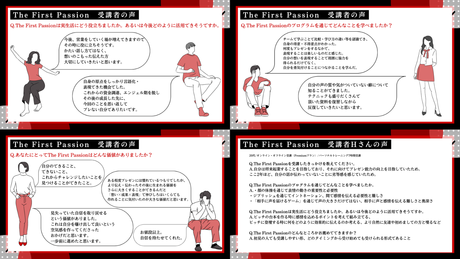 「The First Passion 表現コーチングスタジオ」は、演劇で使われる表現方法をビジネスに応用し、プレゼンテーションやコミュニケーション能力の強化を支援するオンデマンド講座の提供を開始し、定期開催であるオンライン・オフライン講座も継続的に提供しています。受講者の評価からも、この講座がコミュニケーション能力向上に効果的であることがわかります。