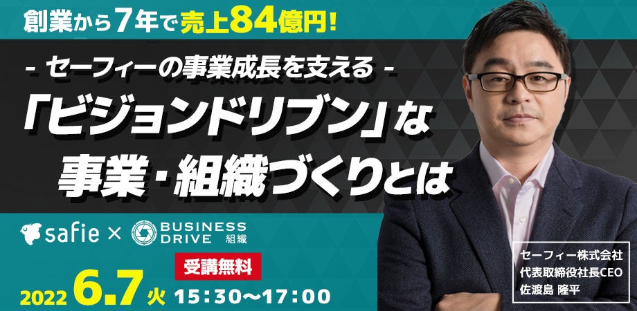 世界初の組織改善AIクラウドサービス「BUSINESS DRIVE 組織」を提供する株式会社鶴(所在地:東京都中央区、代表取締役:今井達也、以下「当社」)は、クラウド録画サービスシェアNo.1のセーフィー株式会社の代表取締役社長CEO・佐渡島隆平氏をゲストにお招きして、2022年6月7日(火)15時30分からWebセミナーを開催します。7年で売上84億円を達成したセーフィーの事業成長を支える「ビジョンドリブン」な事業・組織づくりのポイントをお伺いします。