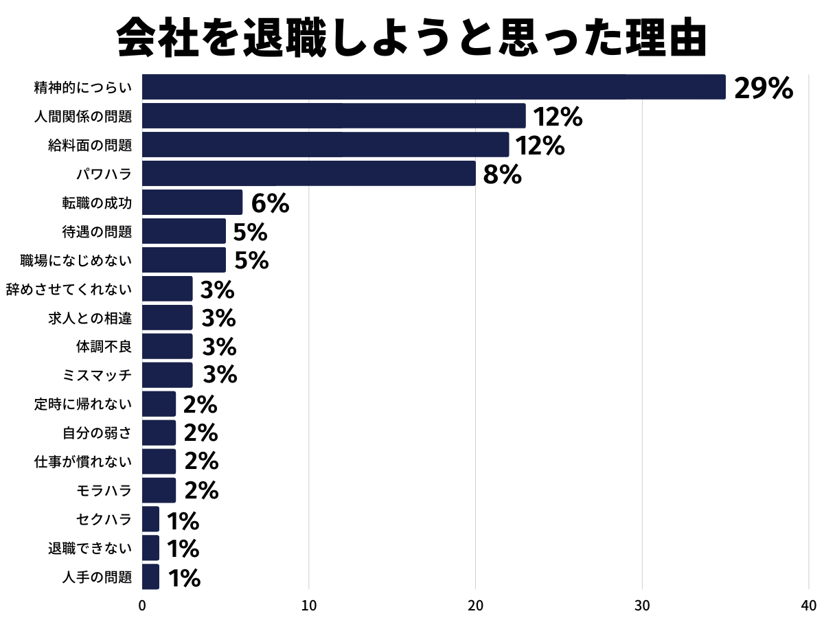 - 退職理由の第一位は「精神的に辛い」で29%が回答