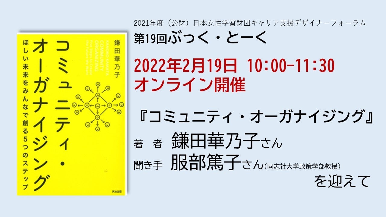 『コミュニティ・オーガナイジング ほしい未来をみんなで創る5つのステップ』著者 鎌田華乃子さんを迎え、第19回ぶっく・とーくを開催:参加者募集!【2月19日オンライン】主催:(公財)日本女性学習財団