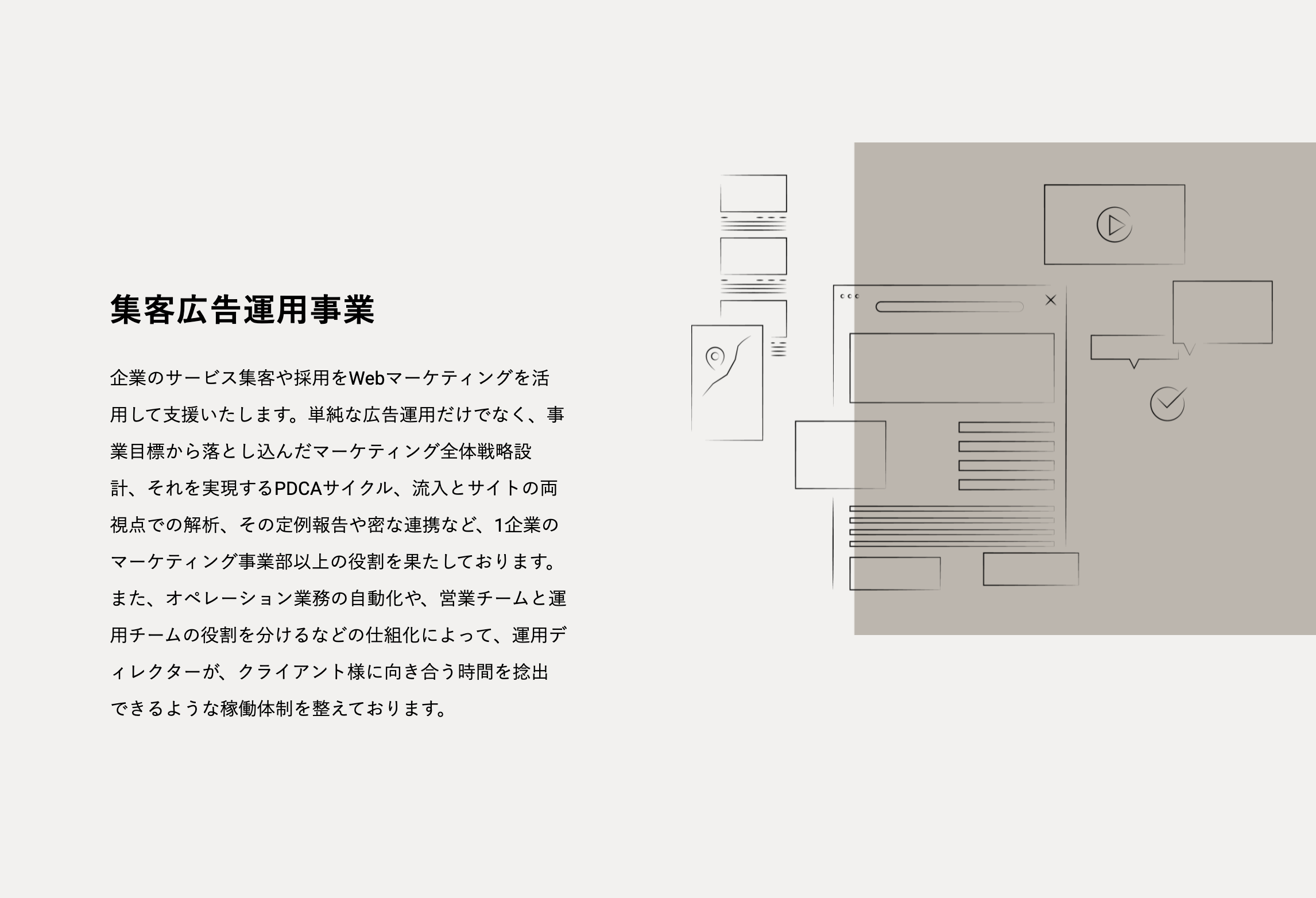 NoSHAPEの集客広告事業の最大の特徴は「媒体費に変動しない手数料定額制モデル」であることです。広告運用にかける工数ベースで手数料を設定しており、広告出稿にかかる媒体費に依存しない広告運用を実行します。