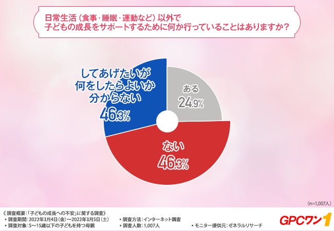 そこで、「日常生活(食事・睡眠・運動など)以外で子どもの成長をサポートするために何か行っていることはありますか?」と質問したところ、『ある(24.9%)』『ない(46.3%)』『してあげたいが何をしたらよいか分からない(28.8%)』という結果になりました。