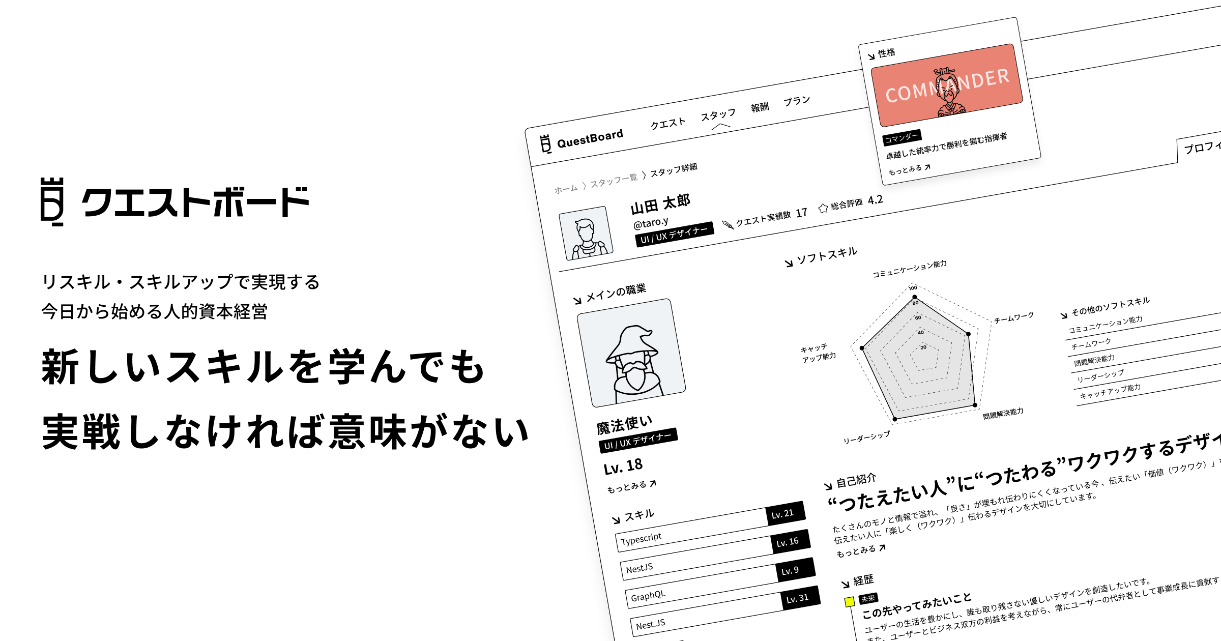 株式会社QuestBoard(東京都中央区:代表取締役 濱田 淳、以下「当社」)は、 2024年8月1日、リスキル・スキルアップで人的資本経営を実現する「クエストボード」のサービスデザインを刷新したα版Ver2を公開いたします。