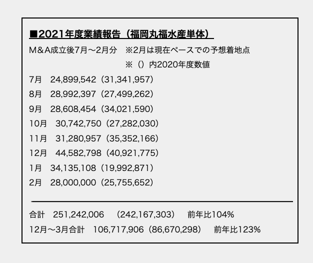 同社は、2021年6月4日に水産加工工場である株式会社福岡丸福水産(以下「福岡丸福水産」)をM&Aし、グループ傘下に迎えました。M&A後、福岡丸福水産の7月〜2月の売上合計は前年比104%(直近3ヶ月合計は前年比123%)になるなど、業績を伸ばしています。福祉事業を行う企業の傘下に入ることで工場の障がい者雇用が促進され、作業効率が改善したことなど、M&A後の変化について、B.Continueの島野社長と福岡丸福水産の倉橋会長へのインタビューを中心にお伝えします。