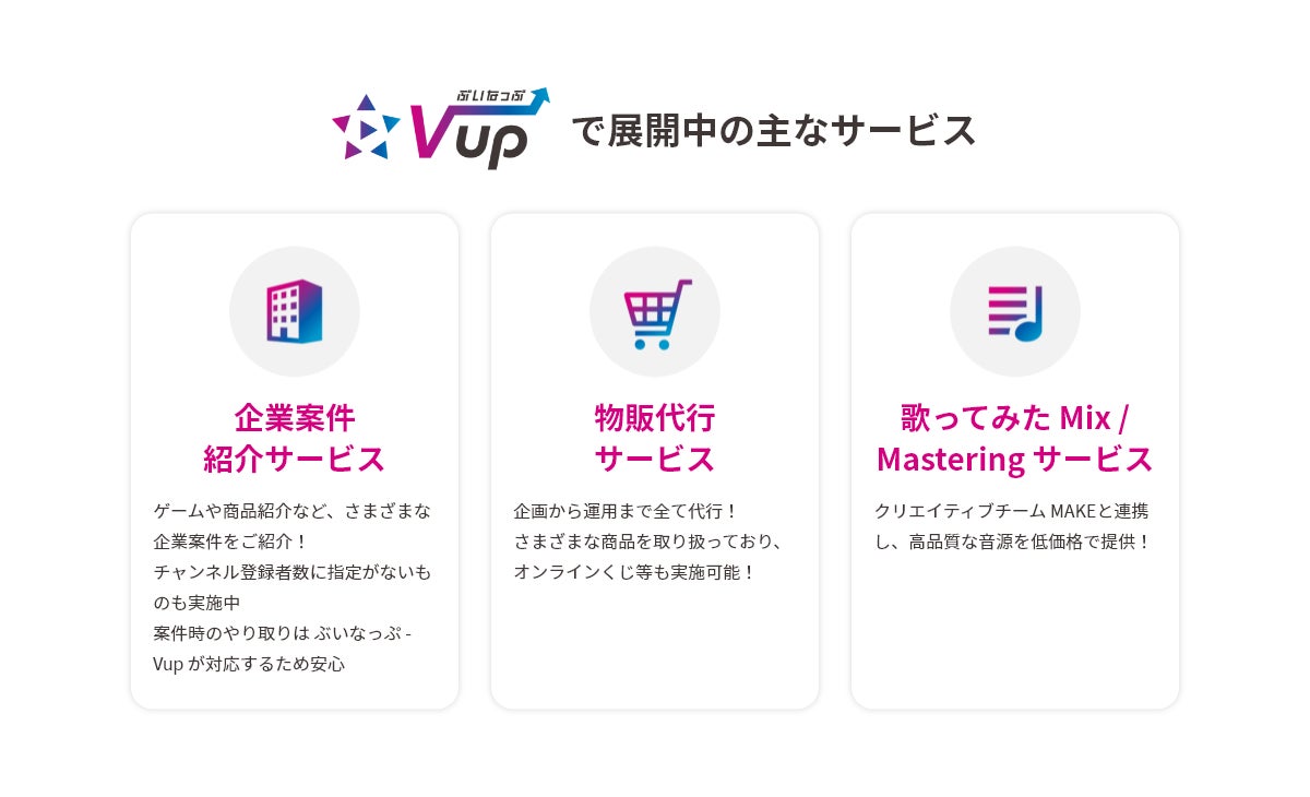 ぶいなっぷ - Vup は企画からVTuberのアサイン、運用まで一貫して行い、独自の管理体制でプロモーションを成功へと導きます。