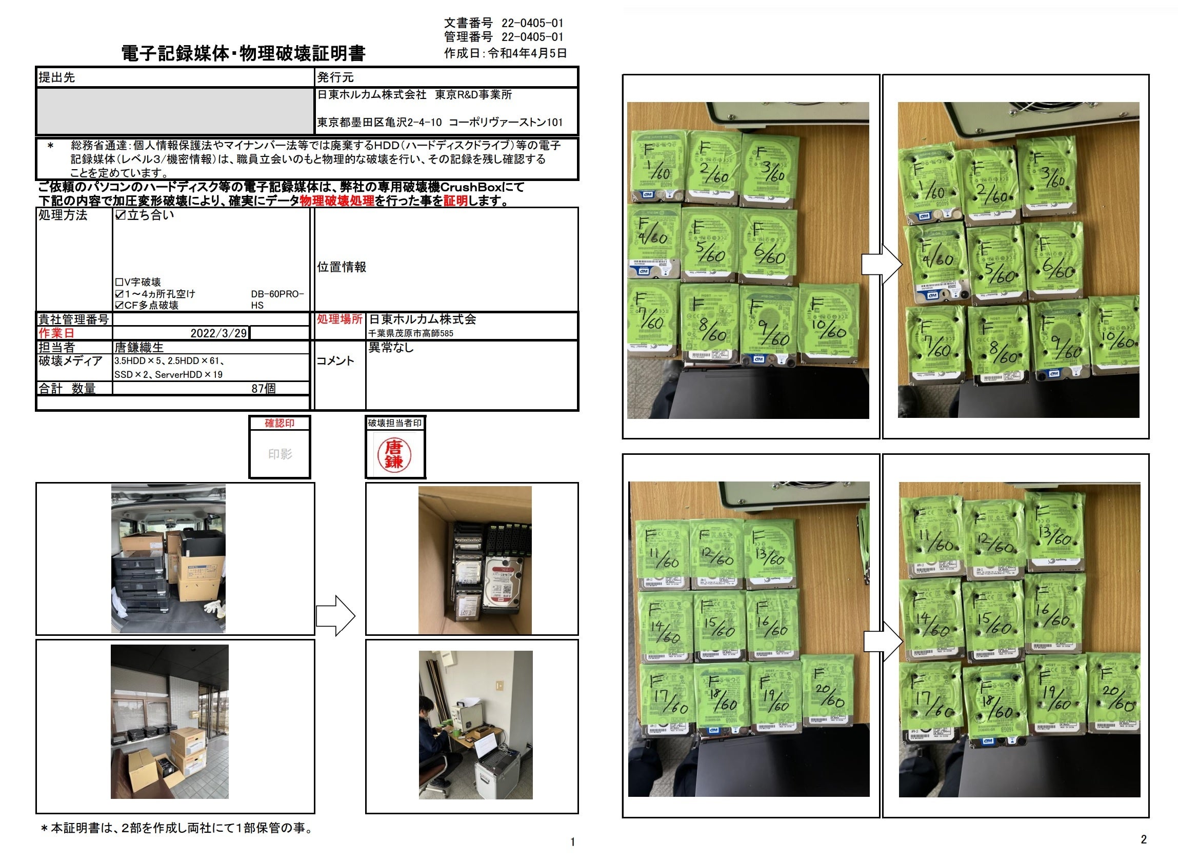 日東ホルカムは、データ消去(物理破壊消去)とパソコン等の手解体処理を行う技術を有しています。