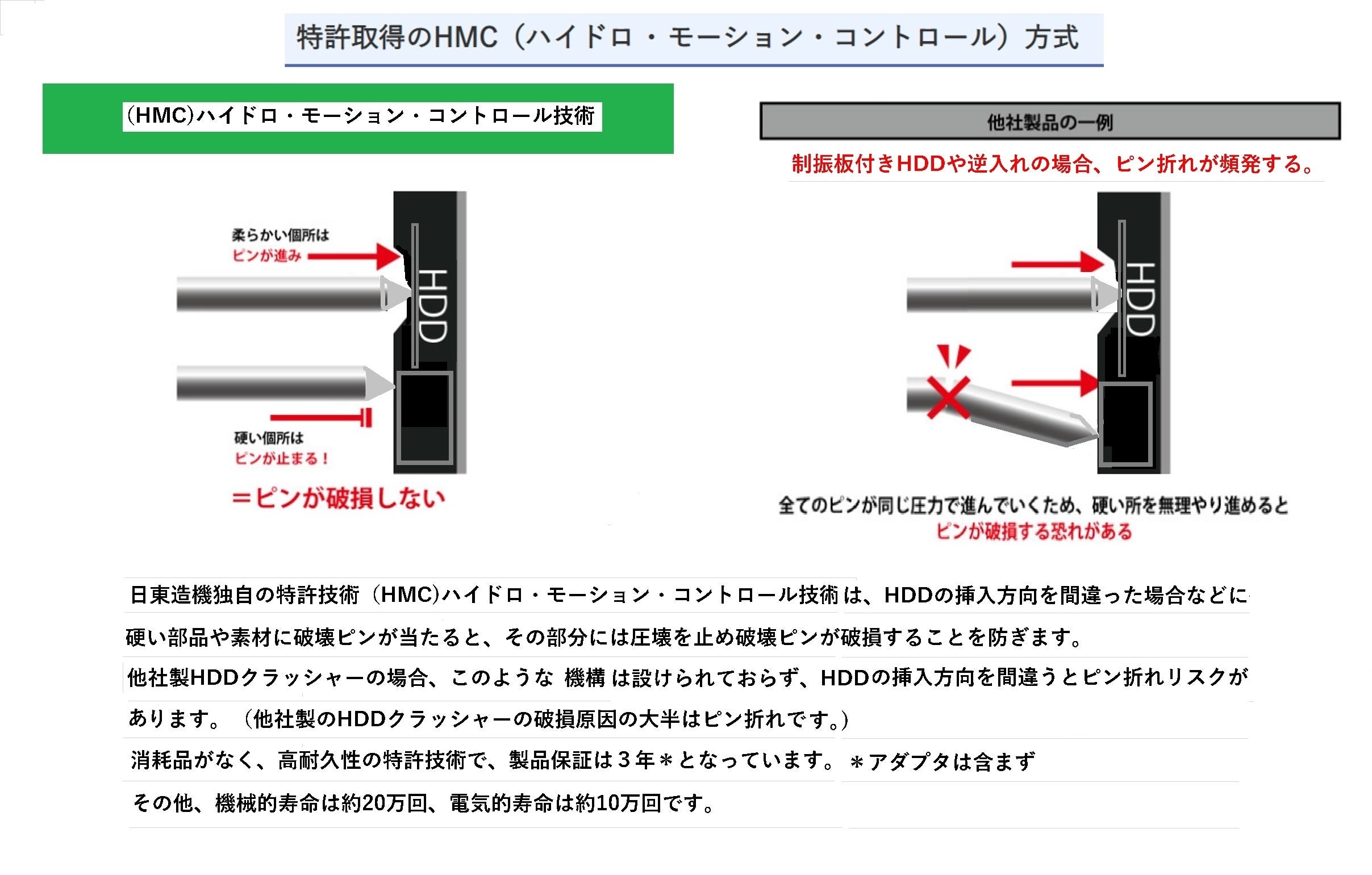 日立、 富士通、NEC、IBMなどの全てのパソコン・サーバー、ストレージ機器メーカーや、世界のITAD事業者に採用されていて、動力性能(3つの破壊手法、破壊完了時間)は他社比3~10倍のコストパフォーマンスを誇ります。