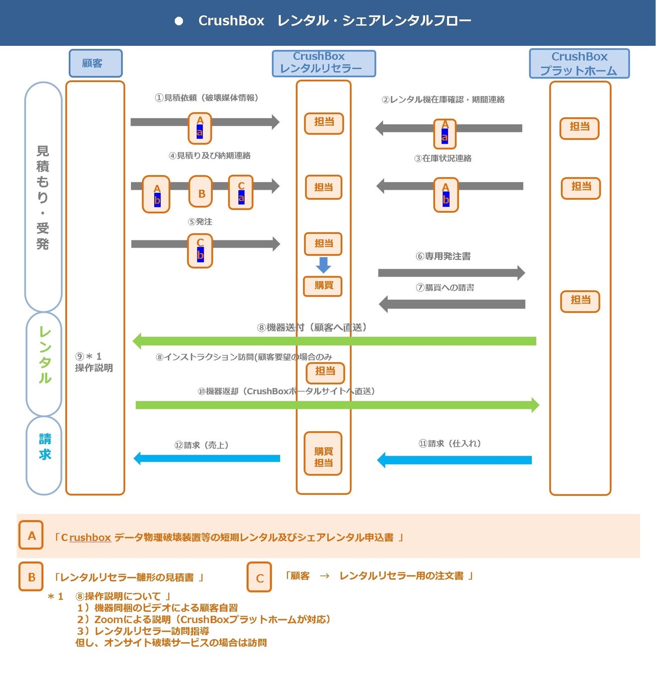 HDD/SSD/LTOなど出張電子記録媒体(ストレージメディア)破壊サービスのシェアレンタルサービスとは、SI事業者、ITAD機器のリユース(買取・寄贈)・リサイクル(手解体プロセス)を、お客様の指定地に出向いて複合物理破壊サービスを行い、排出、運搬、報告にかかったコストをCrushBoxレンタルリセラー(連携者)とシェアリングするソリューションサービスです。