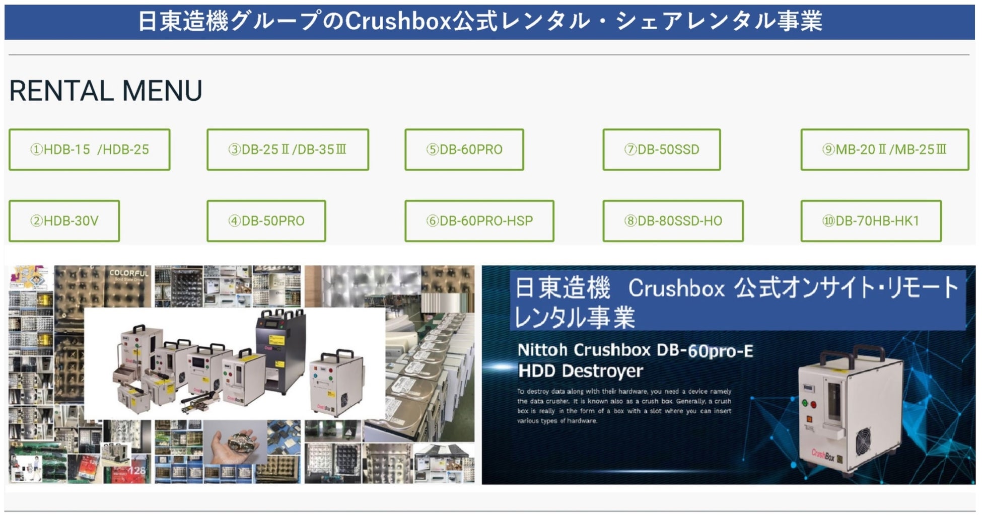 日東ホルカム株式会社は、日東造機CrushBoxシリーズの国内外への販売・レンタル・シェアサービスを通じてITAD事業者との新たなシェアレンタルビジネスを推進して参ります。