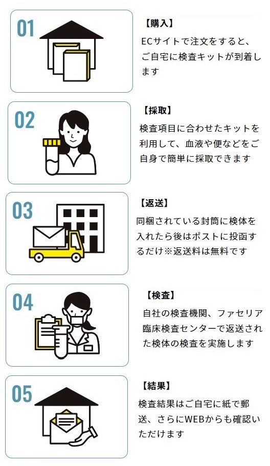 ・購入から検査結果がわかるまではシンプルな5つのステップのみ。