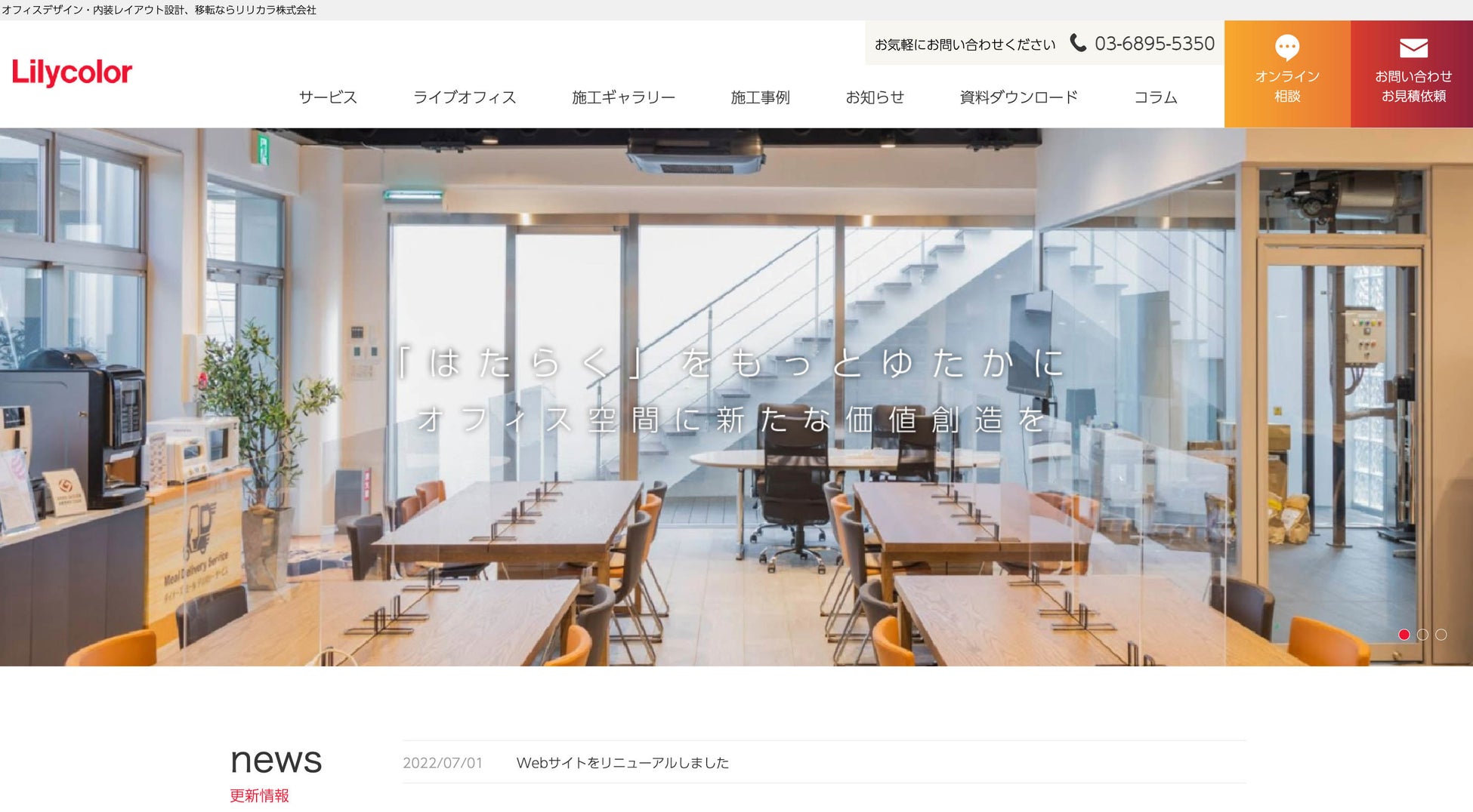 1968年にオフィス事業をスタートさせ、現在まで30,000件以上の法人顧客の案件を手掛けてきたリリカラ株式会社 スペースソリューション営業本部(所在地:東京都港区、常務執行役員 スペースソリューション事業統括:原 伸)が運営するオフィス空間づくりのノウハウと事例の発信を行うwebサイト(https://lilycolor.co.jp/ss/) を7月1日にリニューアルしましたのでお知らせします。