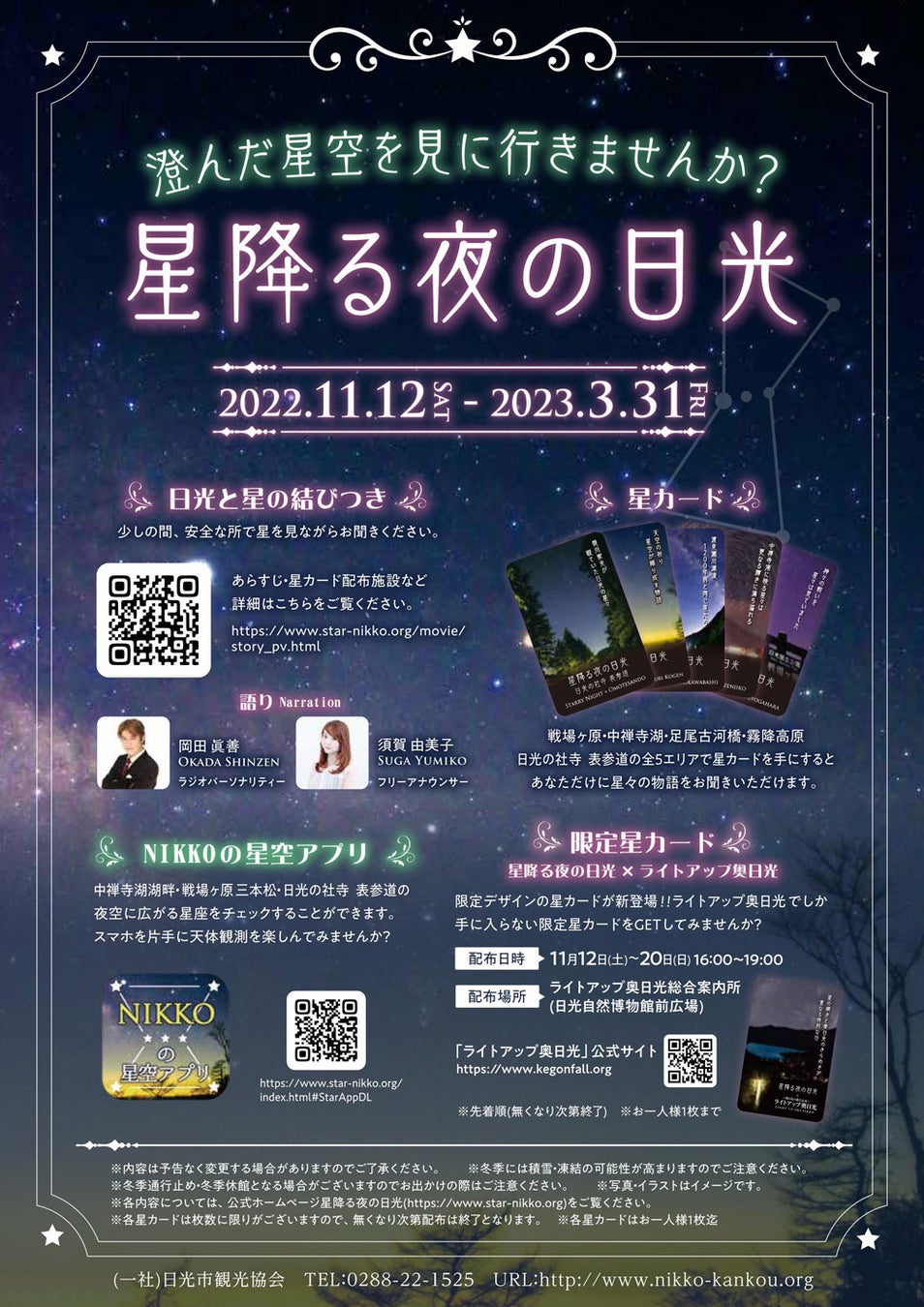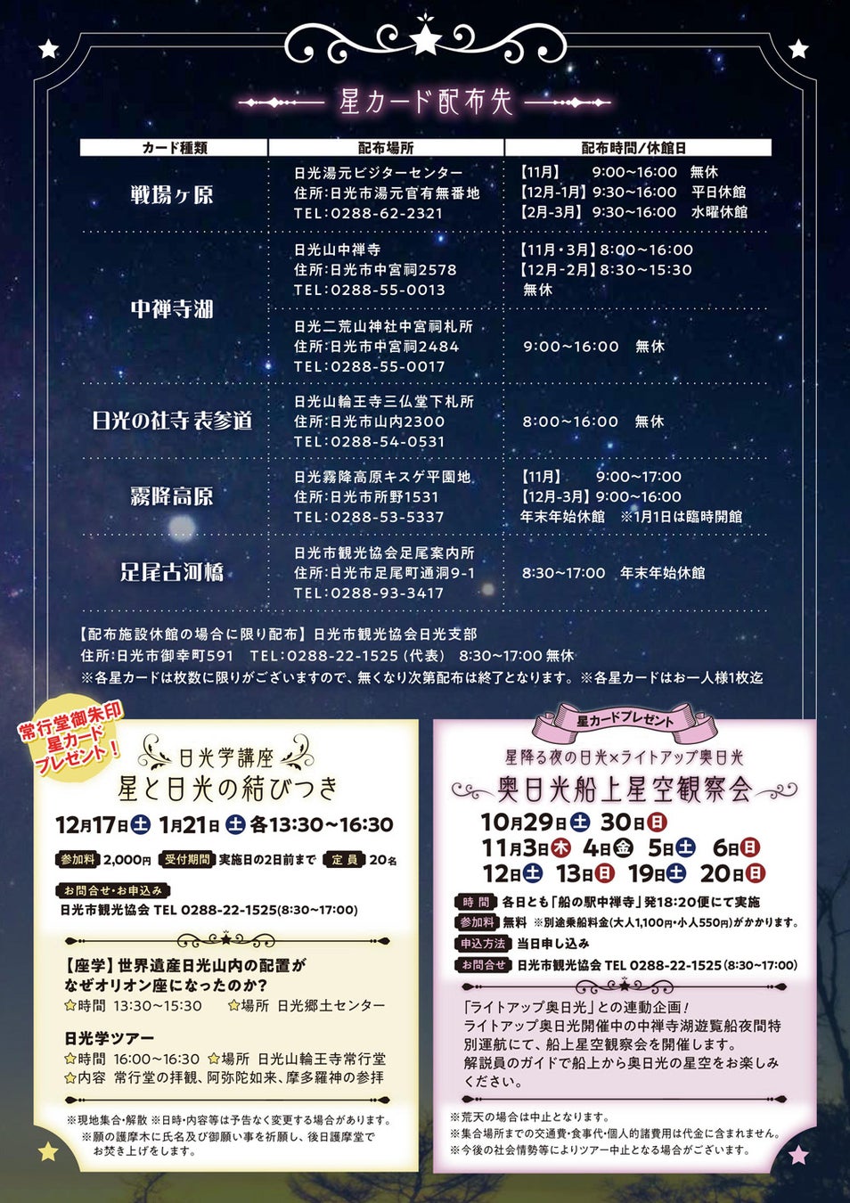 来る11月12日(土)から来年3月末日までの期間に、日光を周遊しながら各スポットで特製「星カード」を受け取り、裏面のQRコードを読み込むと各スポットにまつわる星のストーリーを聞くことができます。