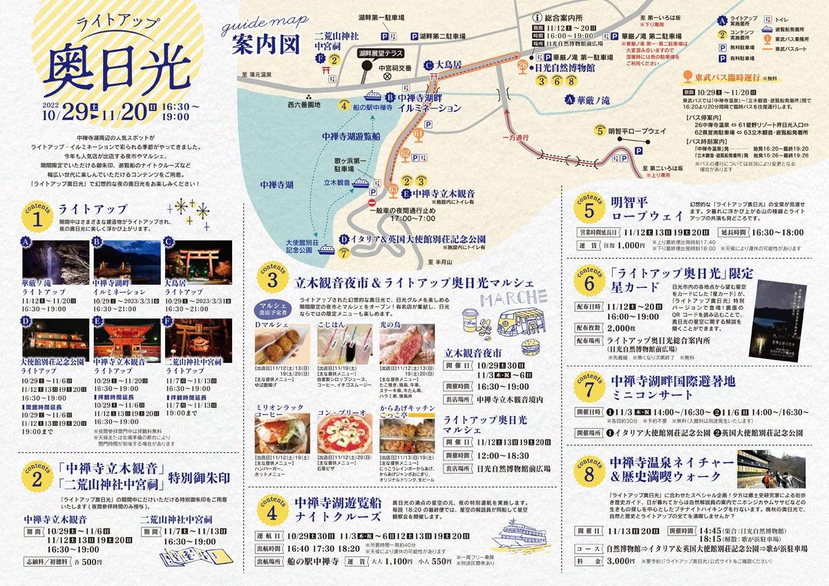 開催期間中には、日光の有名店が集結したマルシェで地元ならではの限定グルメを味わっていただけたり、中禅寺湖遊覧船でナイトクルーズを楽しんでいただくこともできます。また、中禅寺立木観音、二荒山神社中宮祠では、夜間参拝(無料)や、特別御朱印の授与(有料)など、各スポットで様々な催しが行われます。