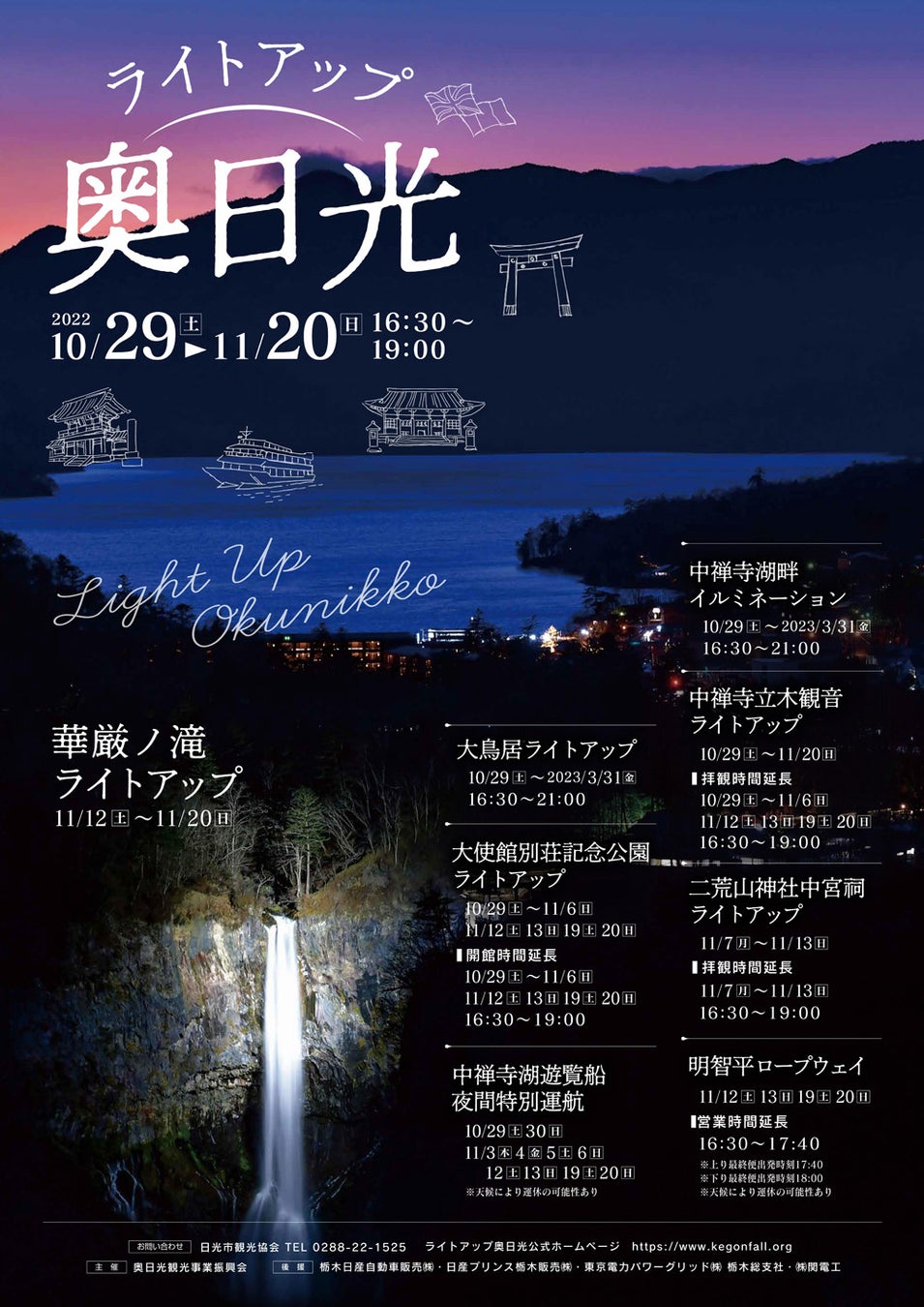 栃木県日光市では、世界遺産である「日光の社寺」をはじめ、大鳥居や中禅寺湖畔、日光国立公園内の華厳の滝など、数々の観光名所をライトアップやイルミネーションで色鮮やかに演出するイベントを、この秋より順次開催いたします。日光の新しいブランディング「NEW DAY, NEW LIGHT. 日光」にふさわしく、夜の日光を明るく照らし出すイベントです。