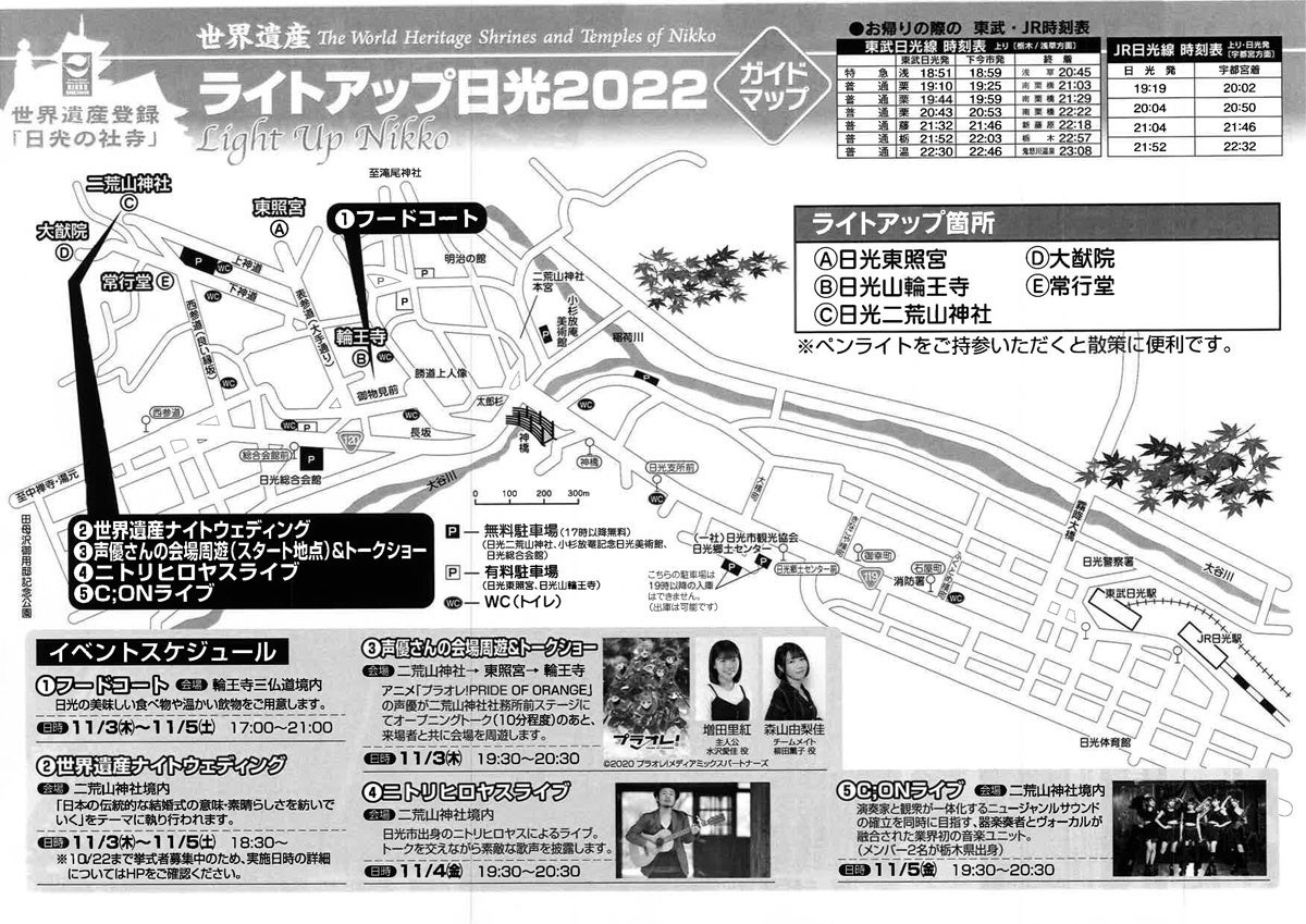 また、二荒山神社境内では、湯波ラーメンや味噌田楽など地元の温かいグルメを楽しめるフードコートや、人気声優・ミュージシャンが登場する野外イベントも開催いたします。昼間の明るい景観とは違った魅力ある雰囲気の中で、秋の夜長をお楽しみいただけます。
