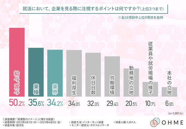 「就活において、企業を見る際に注視するポイントは何ですか?(複数回答可)」と質問したところ、『給与、賞与(50.2%)』と回答した方が最も多く、次いで『業種(35.6%)』『業界(34.2%)』『福利厚生(34.0%)』『休日日数(32.0%)』と続きました。