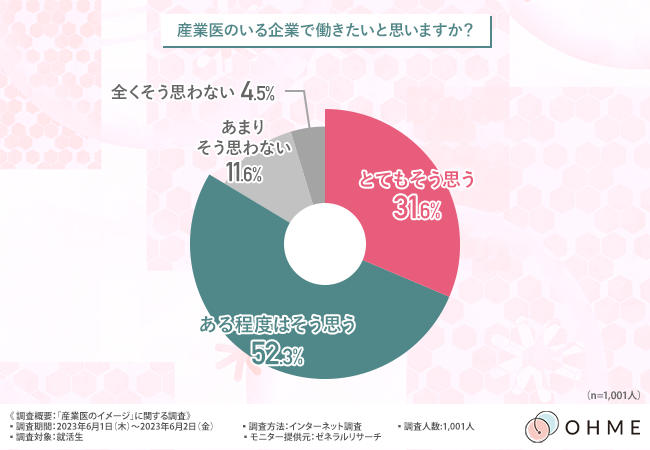 「産業医のいる企業で働きたいと思いますか?」と質問したところ、『とてもそう思う(31.6%)』『ある程度はそう思う(52.3%)』とおよそ84%の就活生が、産業医のいる企業で働きたいと回答しました。