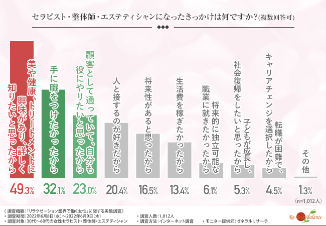「セラピスト・整体師・エステティシャンになったきっかけは何ですか?(複数回答可)」と質問したところ、『美や健康、トリートメントに興味があり、詳しく知りたいと思ったから(49.3%)』と回答した方が最も多く、次いで『手に職をつけたかったから(32.1%)』『顧客として通っていて、自分も役にたちたいと思ったから(23.0%)』と続きました。