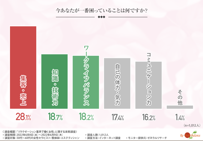 そこで、「今あなたが一番困っていることは何ですか?」と質問したところ、『集客・売上(28.1%)』と回答した方が最も多く、次いで『知識・技術力(18.7%)』『ワークライフバランス(18.2%)』と続きました。