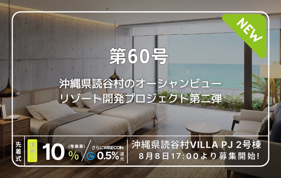 不動産クラウドファンディング「利回り不動産」を提供する株式会社ワイズホールディングス(本社:東京都港区、代表取締役:和泉隆弘)は、新着案件「第60号沖縄県読谷村VILLA PJ 2号棟」の募集を、2024年8月8日(木)19時より先着で開始します。