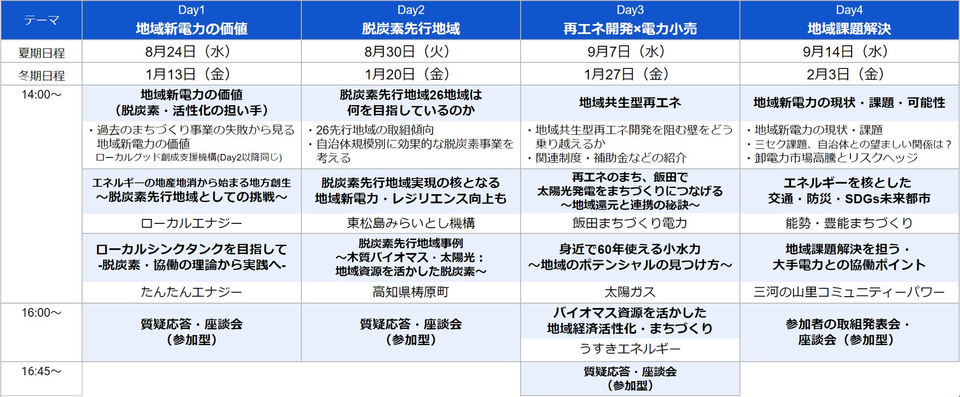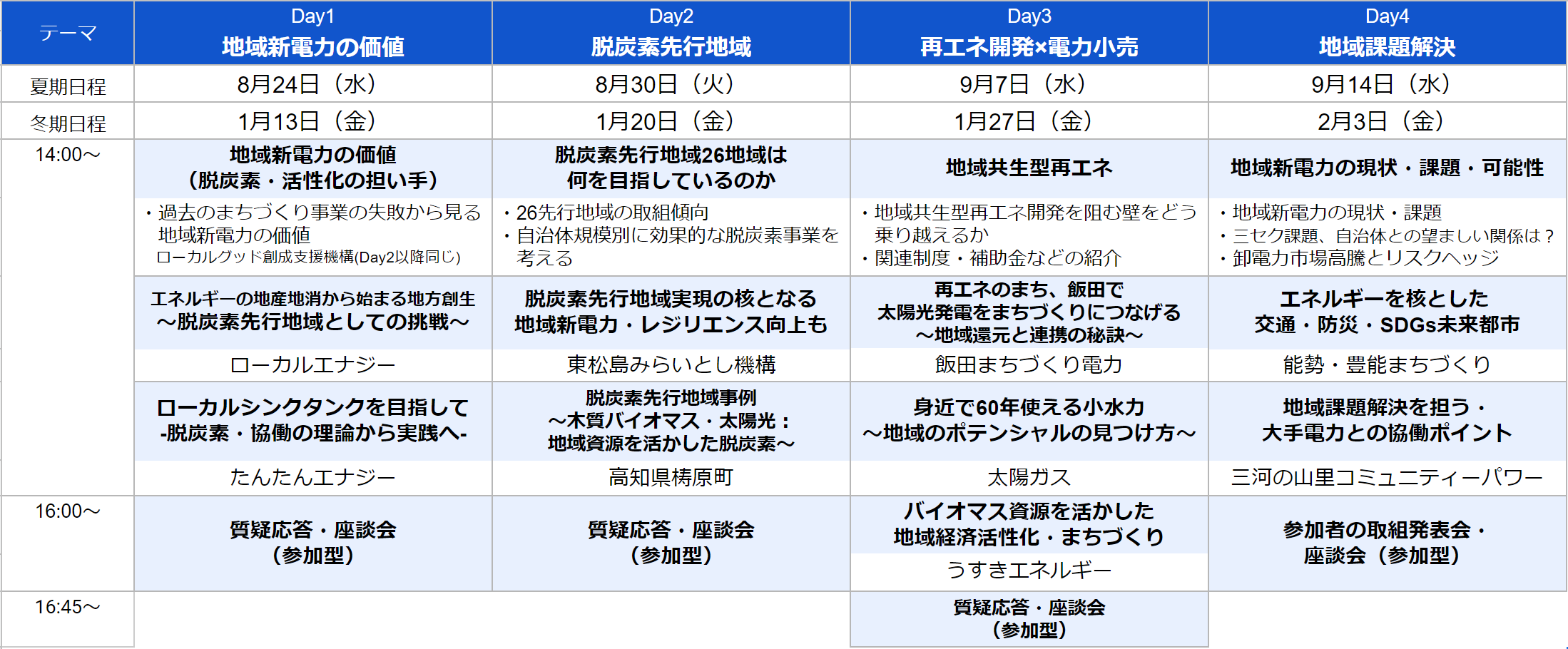 そのため、「地域による地域のための地域新電力講座2022」では、今まさに全国各地で地域に価値を出すため奔走している地域新電力の地域人材から、その事業ノウハウや考え方、成功・失敗経験、そして「思い」を参加者との意見交換を交えながら共有します。また、希望者に対しては、これら地域人材との個別相談も実施し、地域新電力事業・地域再エネ事業を寄り添いながら支援します。
