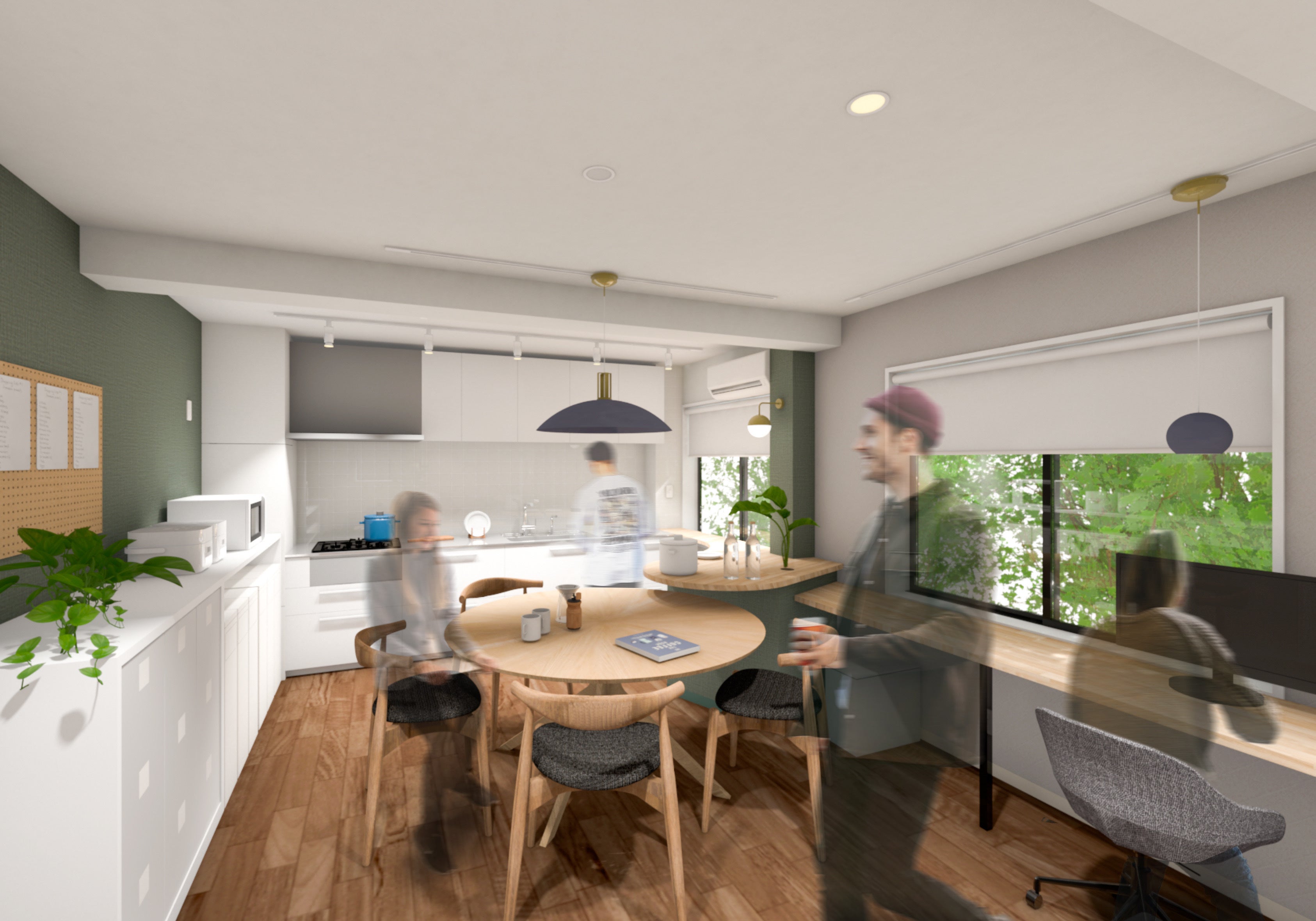 シェアスペースにはリビング、ダイニング、キッチンはもちろんのこと、在宅ワークのニーズにお応えできるようにモニター付きワークスペースを完備。