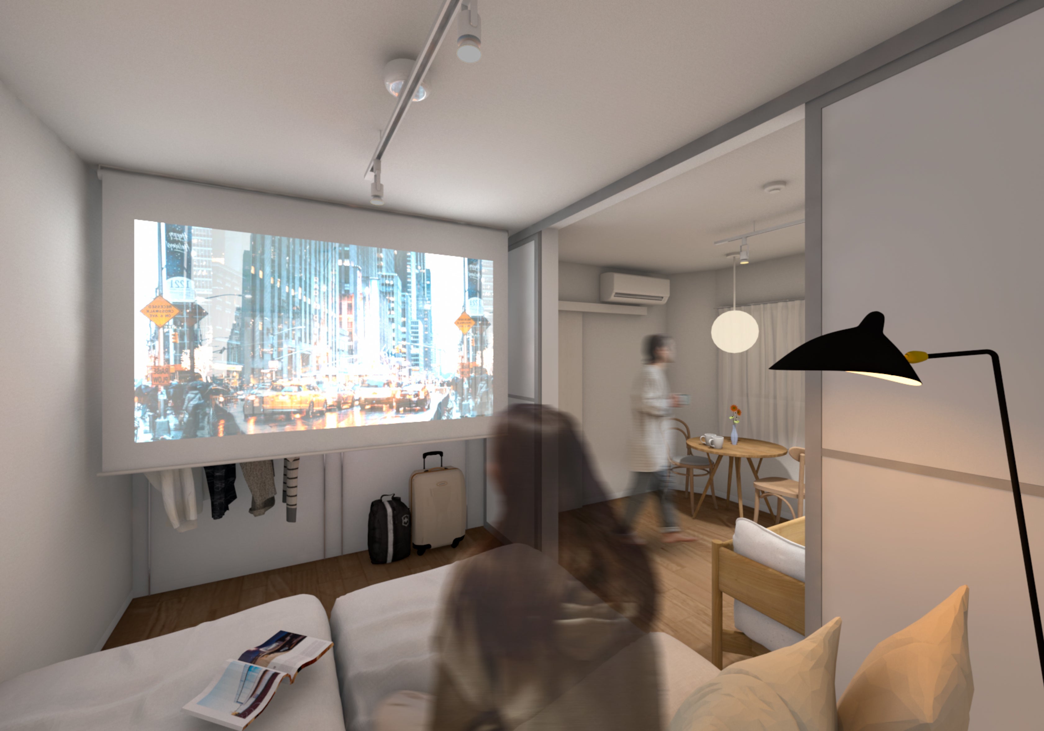 寝室にはプロジェクターも完備しており、大画面で動画を楽しめます。