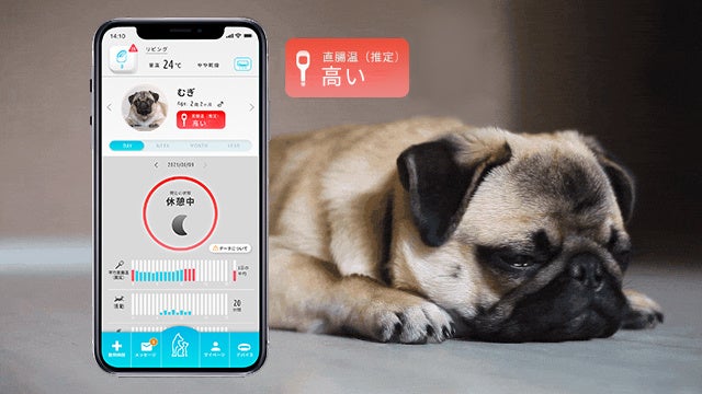 そこで、デバイスには温度センサーを内蔵。さらに直腸温※1を推定する世界でも類を見ないアルゴリズム※2を搭載しています。PetVoiceを装着することで、熱中症につながる体調の変化を見逃しません。