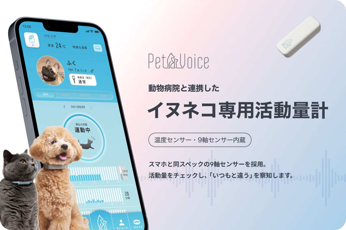 イヌネコ専用活動量計『PetVoice』は、ペット(愛犬愛猫)の健康な毎日をサポートする健康管理デバイスです。普段から健康管理に気遣っている飼い主さんでも気づかないペットの些細な異変にいち早く気づくことで、病気重症化の未然対策に繋がることが期待されます。