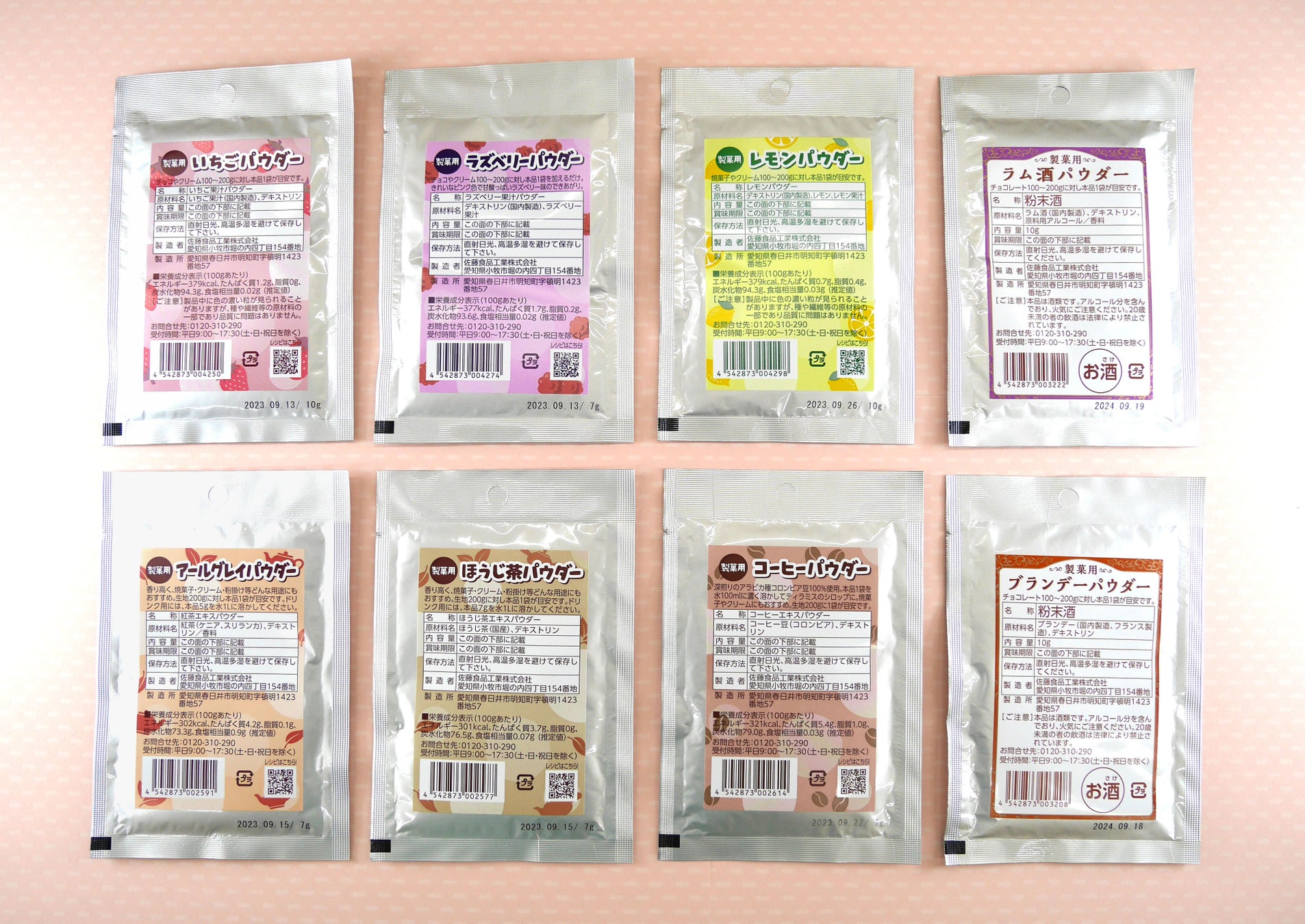 フレーバーは全部で8種類。お子様向けにおすすめの「フルーツパウダー3種」から、近年人気上昇中のお茶スイーツが作れる「カフェパウダー3種」、アルコール香る大人スイーツ向けの「洋酒パウダー2種」まで、豊富なフレーバー展開でおうちでのお菓子作りがさらに楽しくなります。
