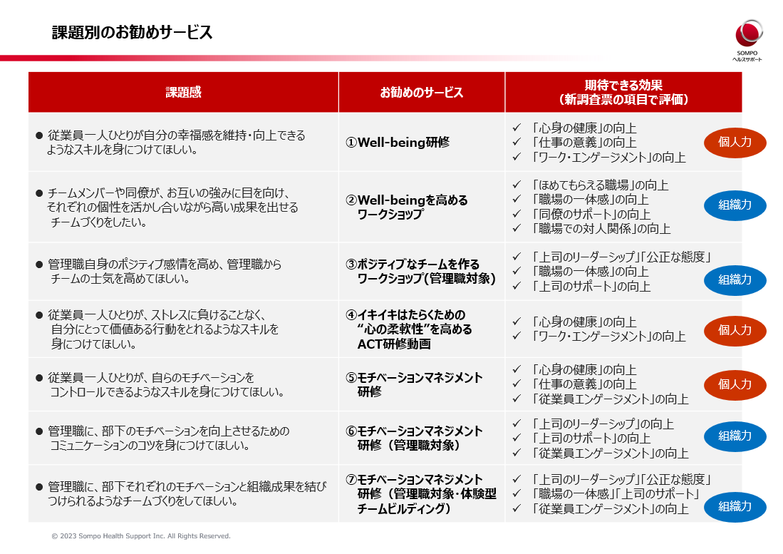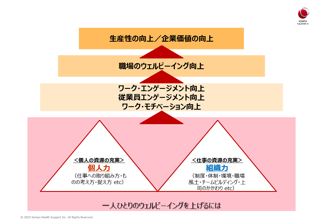 この度、SOMPOヘルスサポートは、メンタルヘルス対応の実績を通じて培ってきた経験・ノウハウを活用し、従業員のエンゲージメントに影響する「個人の資源」および「仕事の資源」を高めるためのサービスを開発しました。