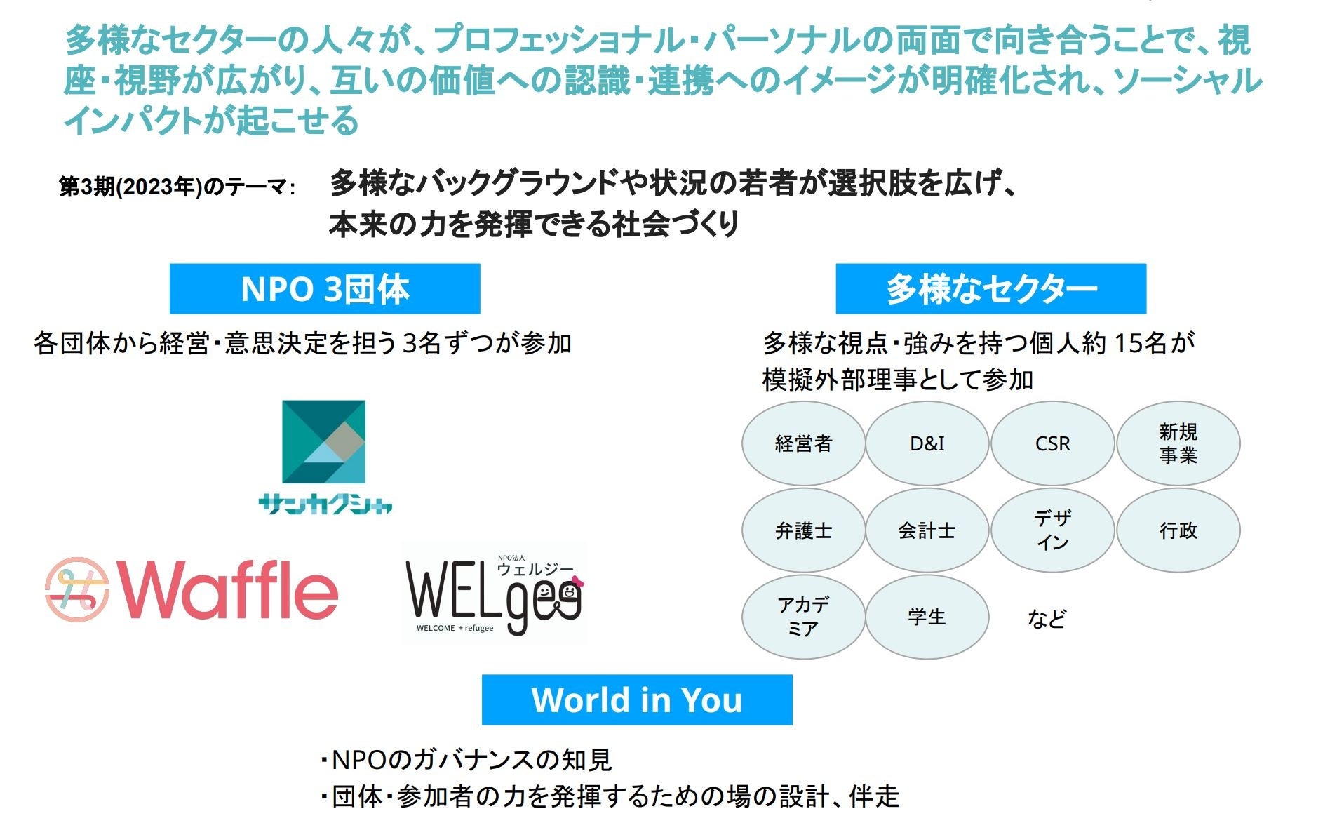 一般社団法人World in You (ワールド・イン・ユー、東京都文京区、代表 山本未生)では、非営利団体と民間企業間の協働を支援し、社会にインパクトを与えるリーダーシップ育成を行うボードフェロープログラム第3期を2023年9月より開始いたしました。